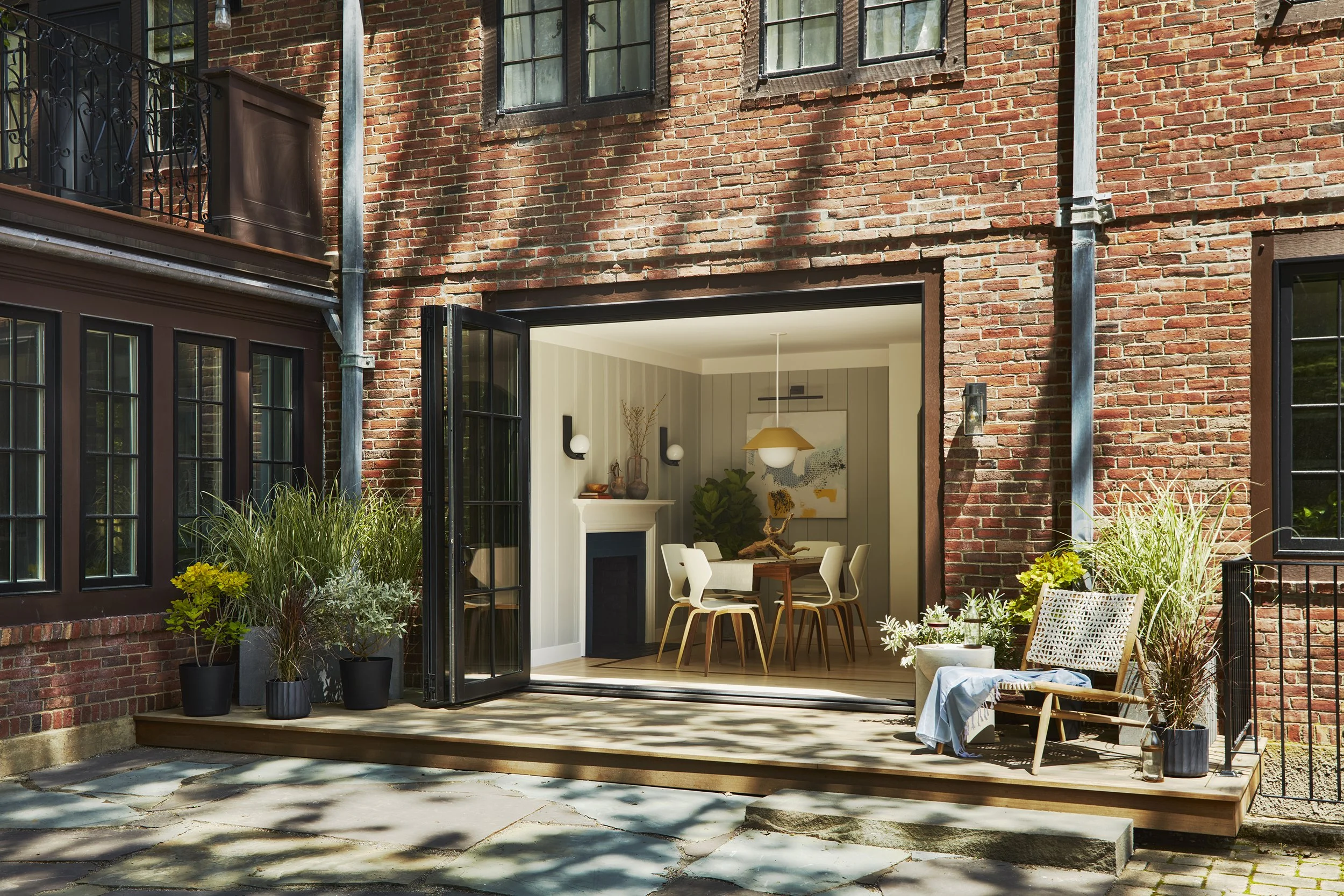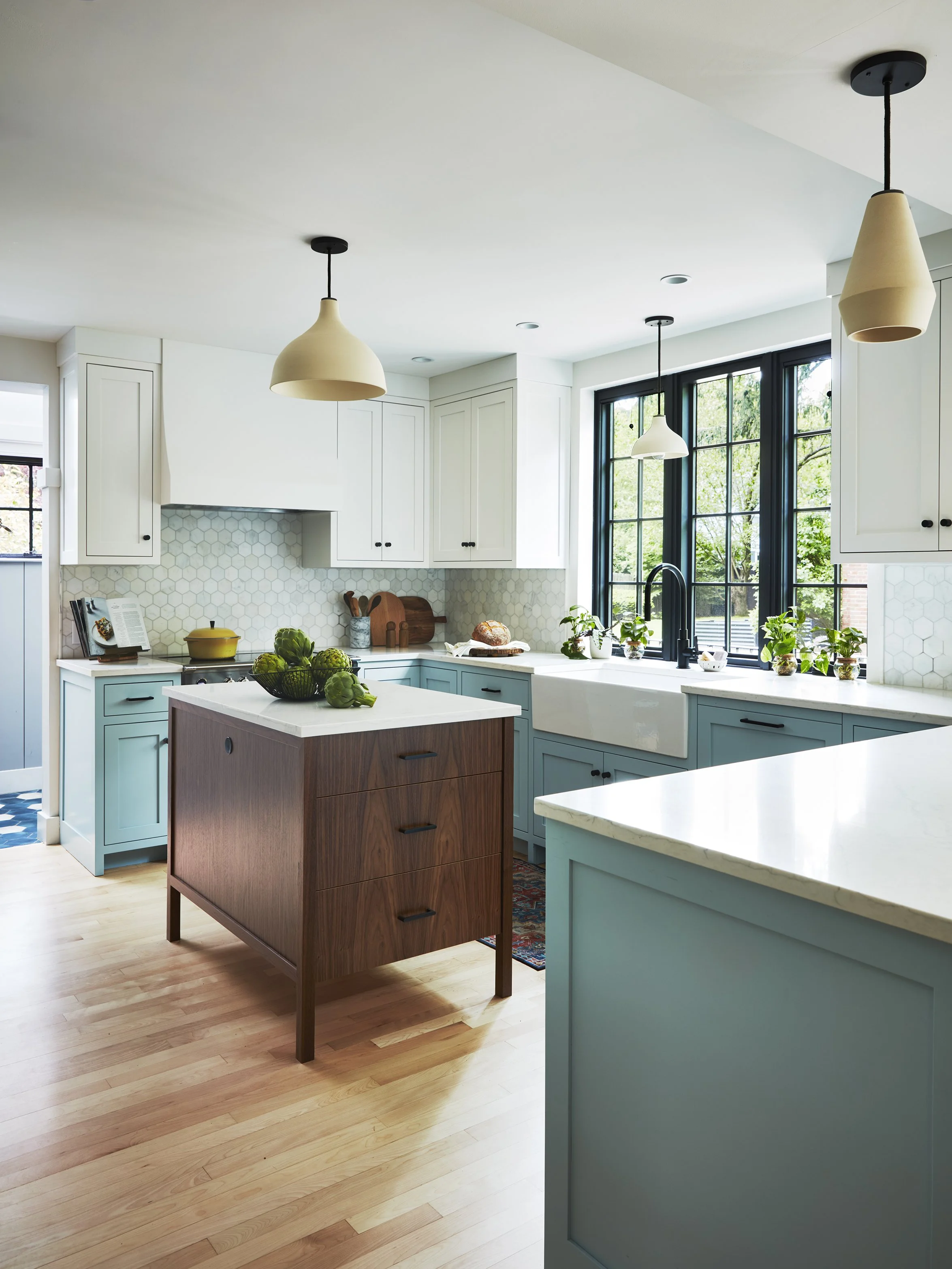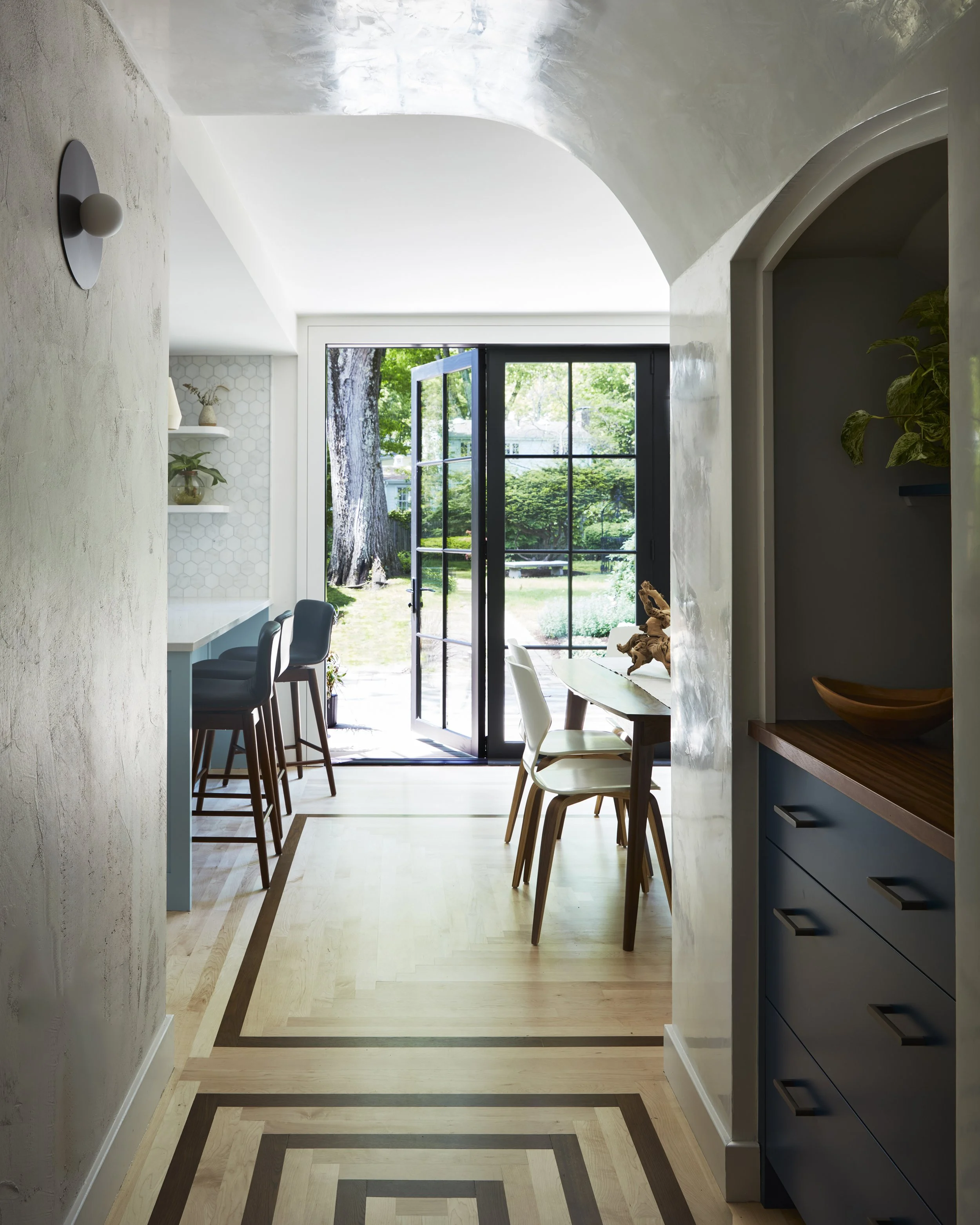 This 1929 Tudor style brick house was bought in 2022 by a young family looking to raise their two children in the city while enjoying the breadth of nature available in the Jamaica Plain neighborhood of Boston. While spacious, the house rigidly separated traditional work spaces like the kitchen and pantry from spaces of leisure, an arrangement that was at odds with this young family’s lifestyle. This renovation created a new sunny eat-in kitchen to serve as a nucleus for family activities while maximizing connections to the landscape oasis behind the home.