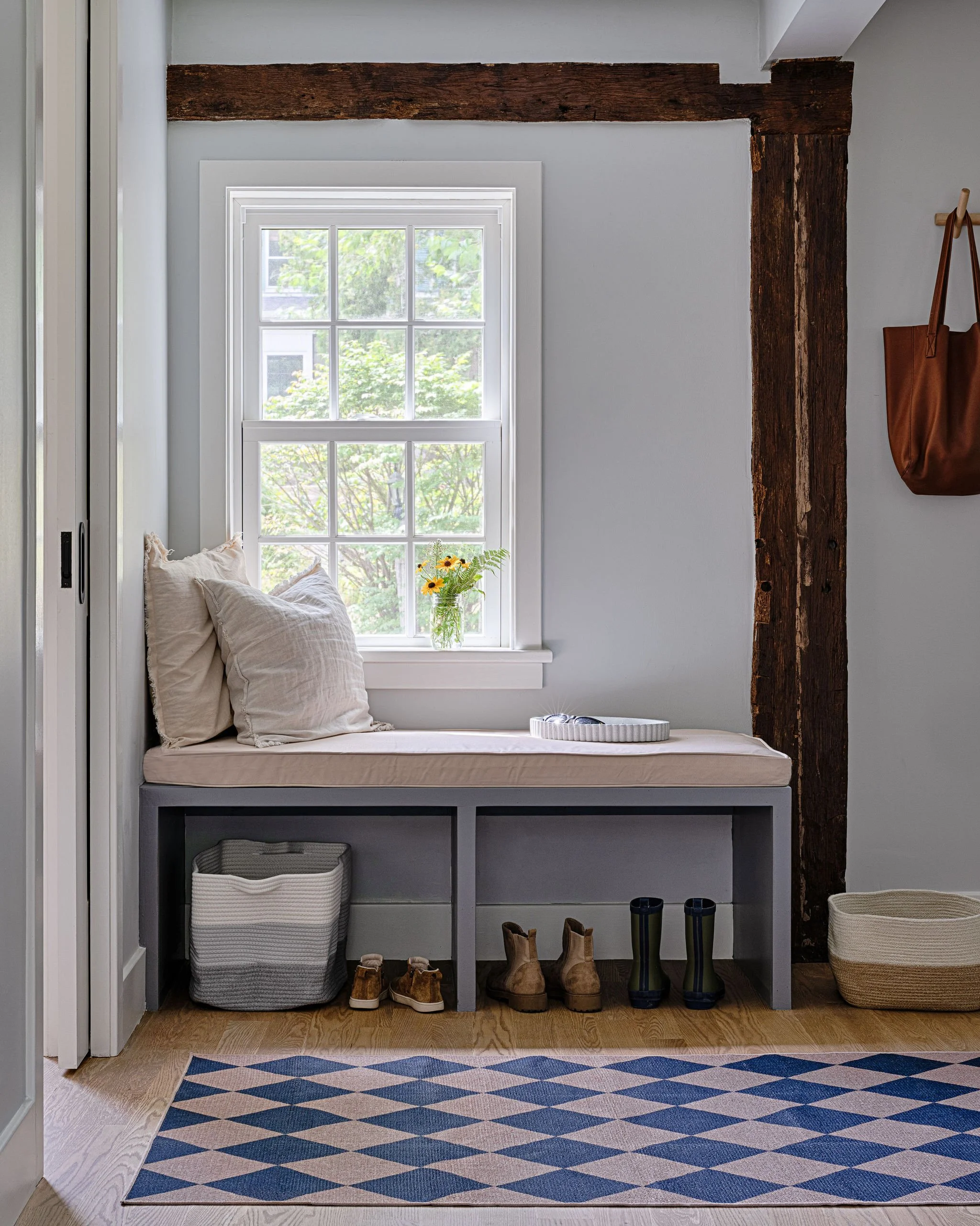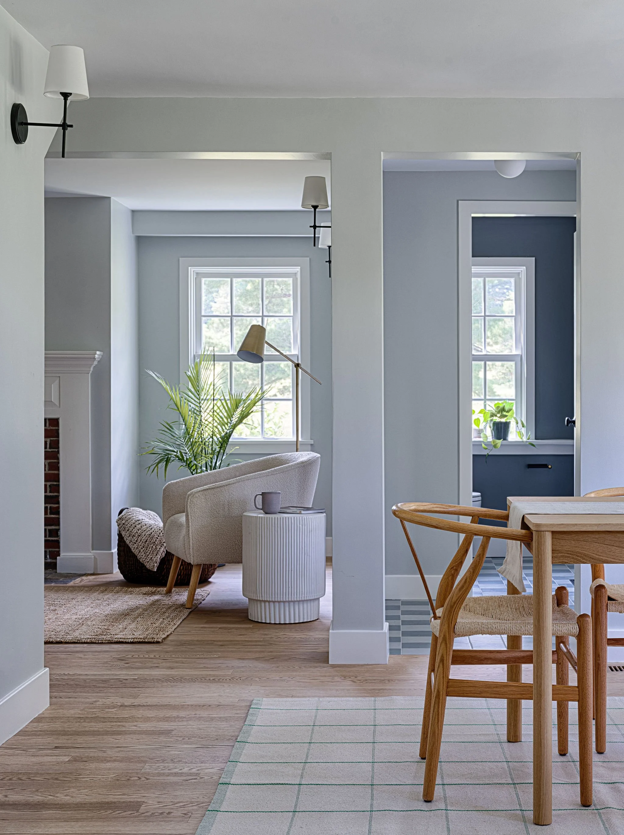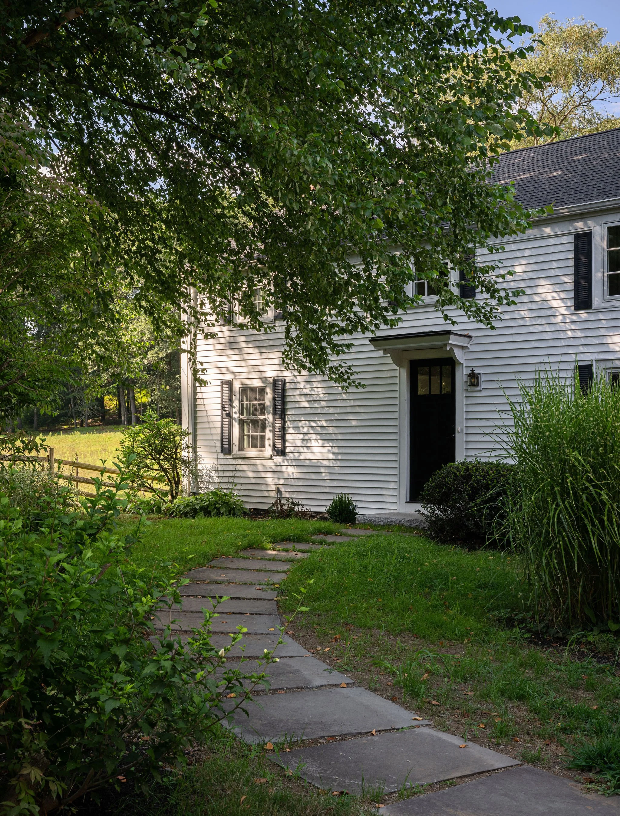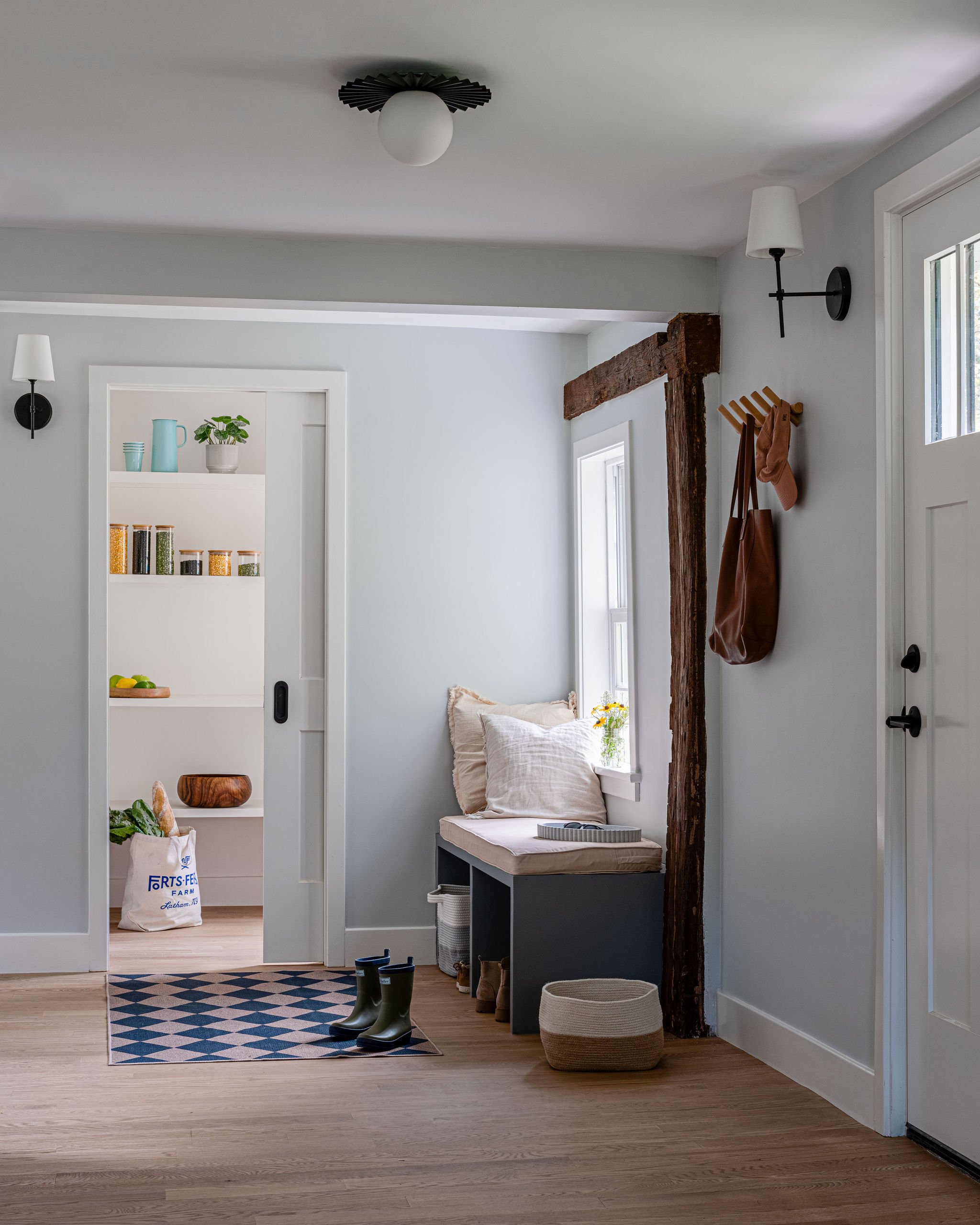 With this renovation of a 1700’s farmhouse on a fourth-generation family farm, we opened the ground floor to create a more spacious feel and added windows to the rear to make the most of the bucolic farm view. Traces of the historic timber framing were exposed while we comprehensively updated the exterior envelope to meet current energy standards and provide larger, operable windows. The existing entry door oddly entered directly into the living space, so by shifting this door over we completed the living room and created a proper entry space while also giving order to the front façade.