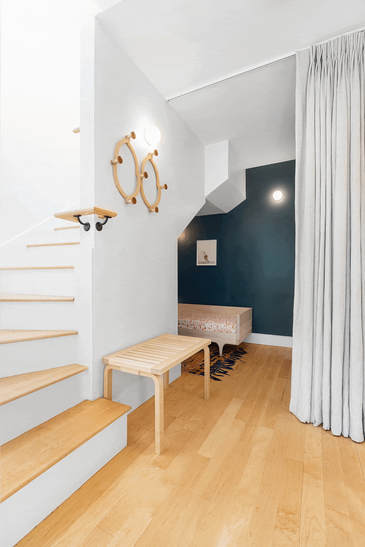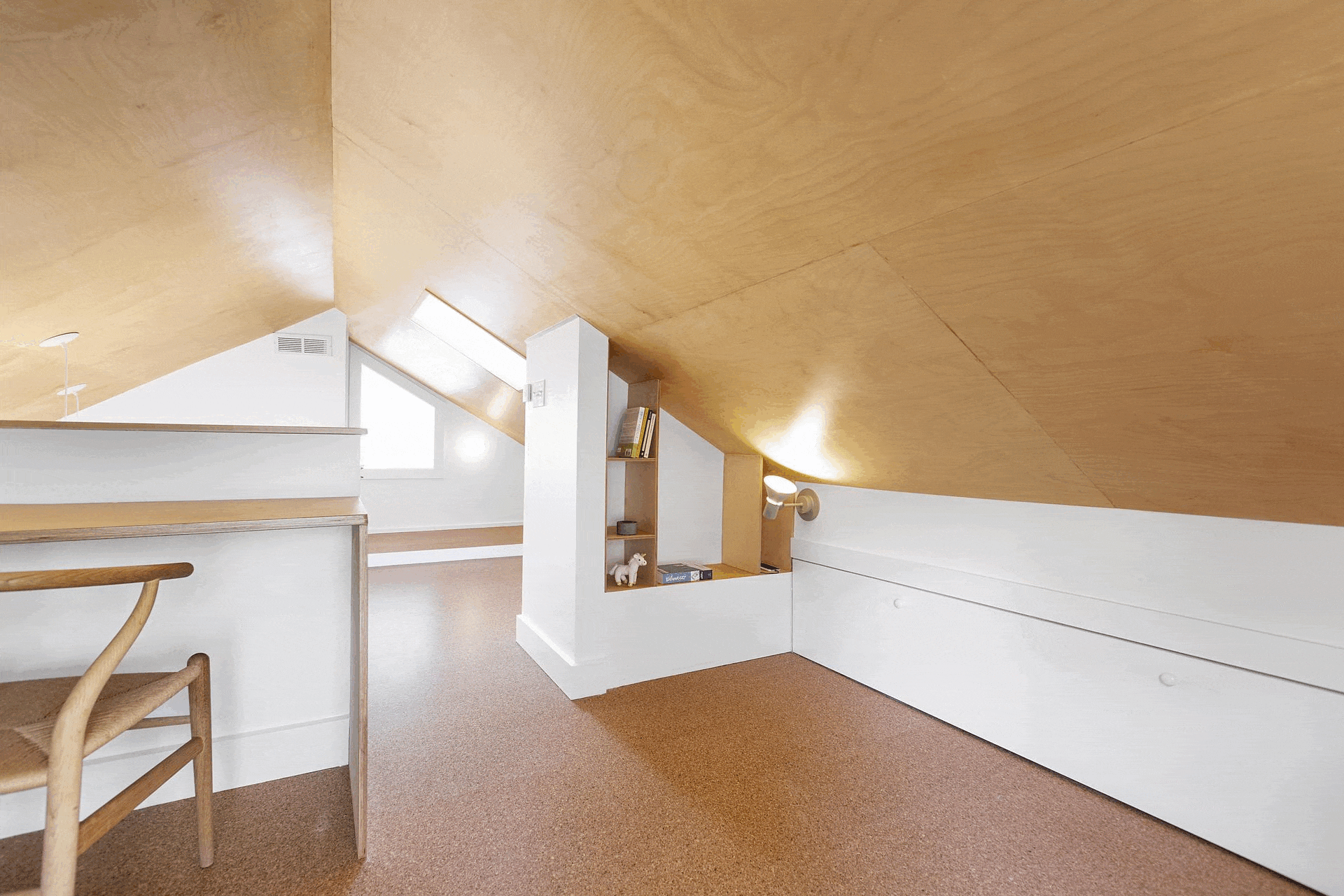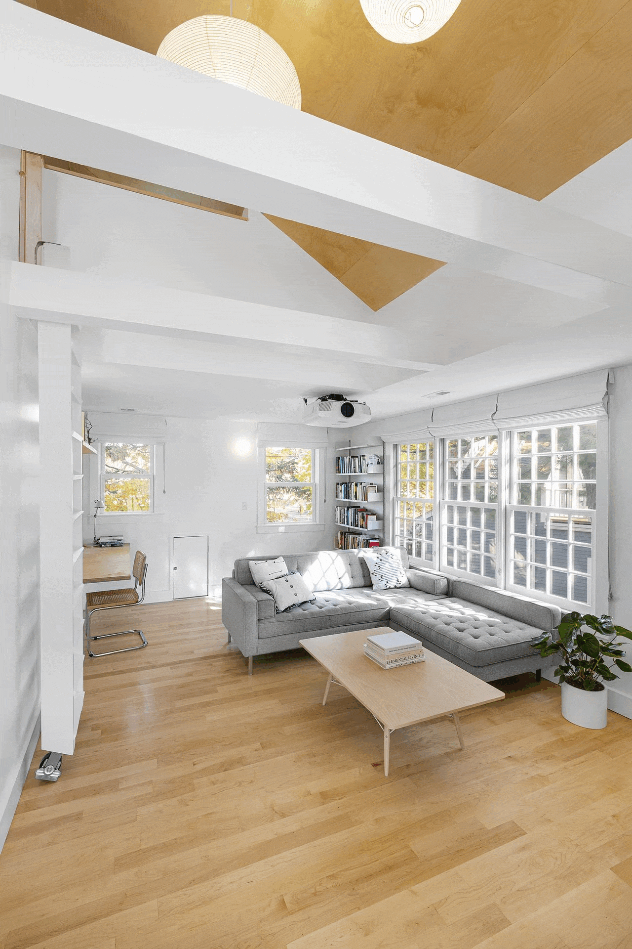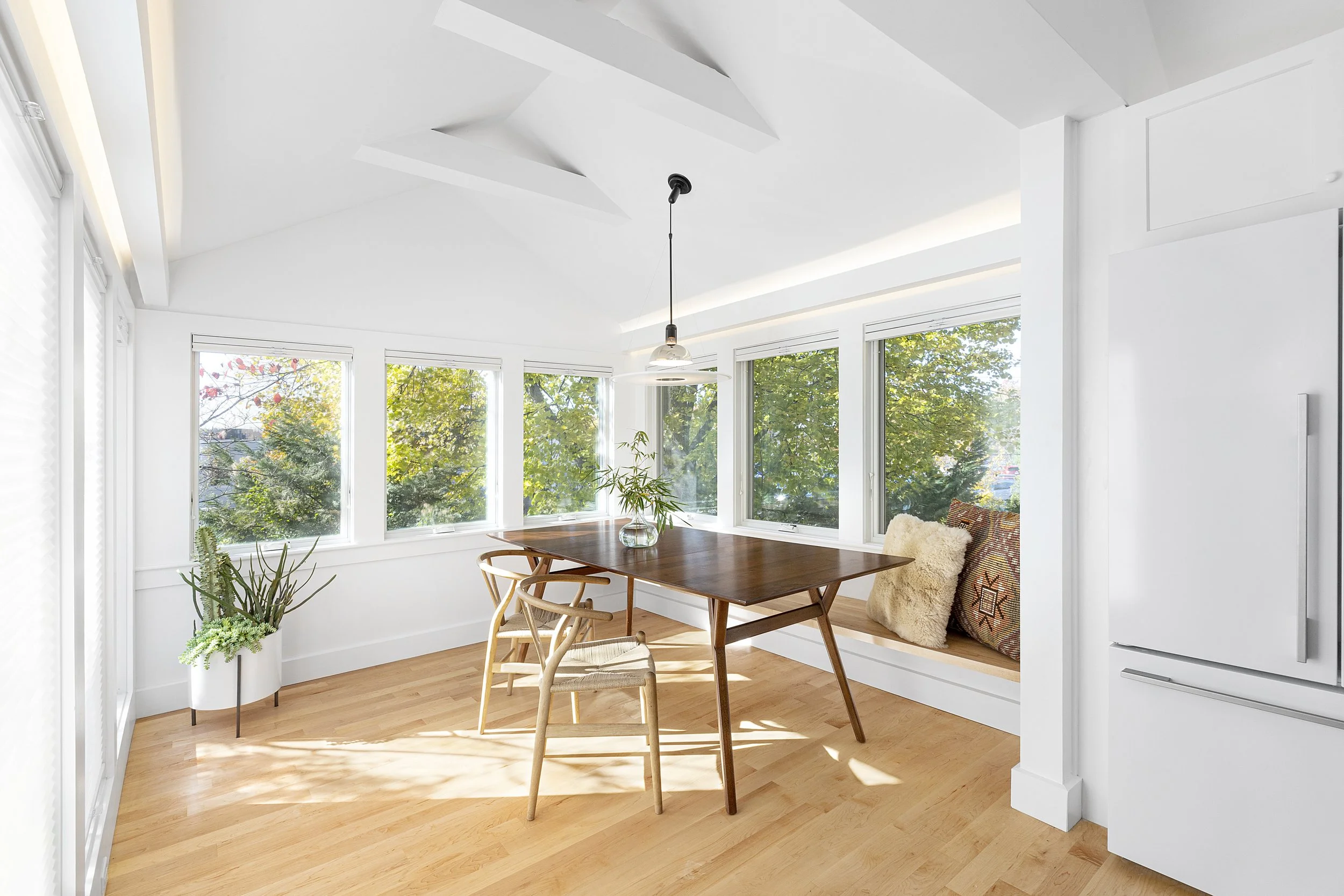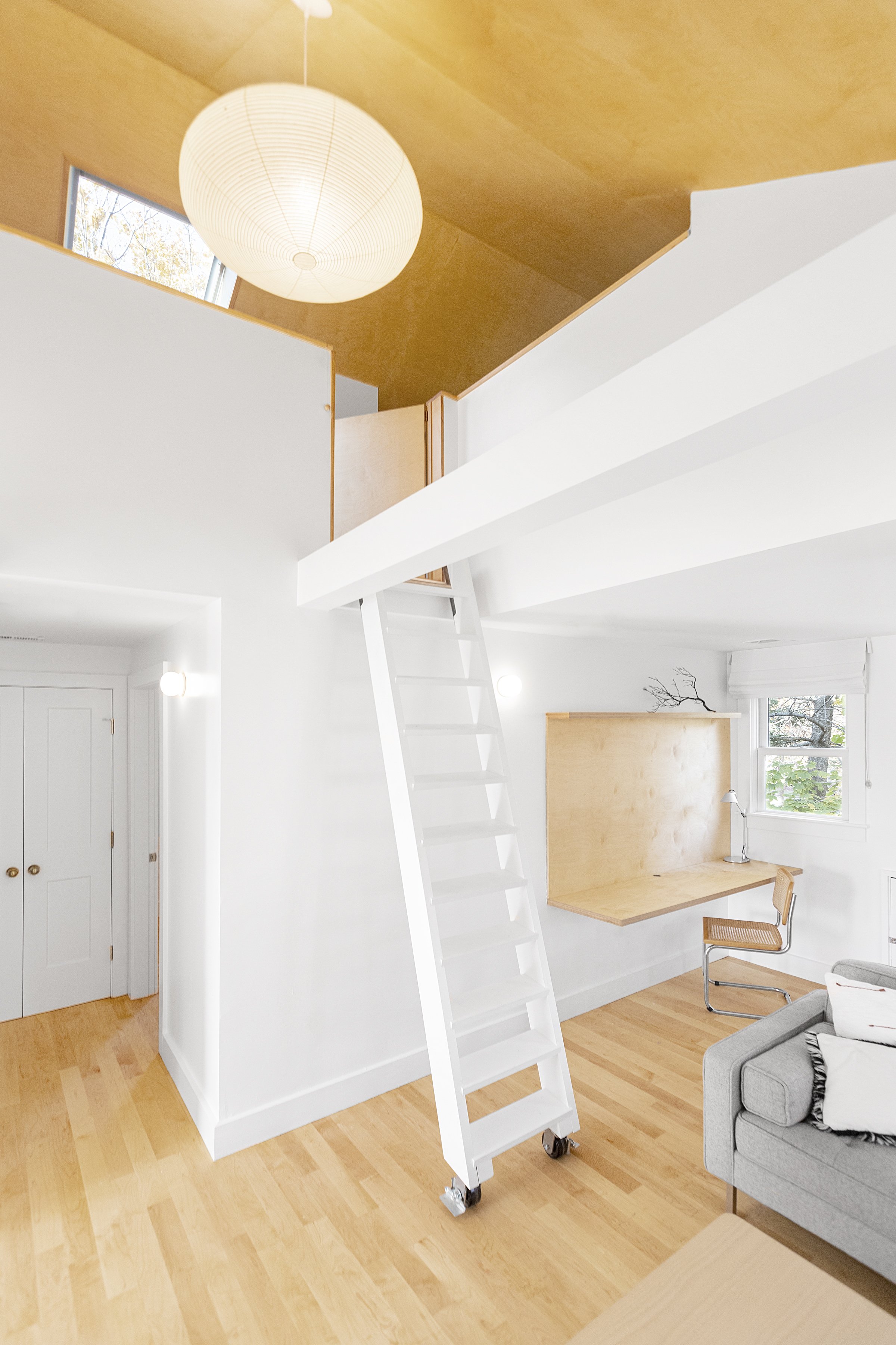 Huron Tree Loft uses adaptability and spatial adventure to overcome a challenging design brief. A petite upper floor flat was tasked with hosting a couple and occasional overnight visits from their children, so adaptable elements allow spaces to be temporarily transformed into sleeping areas and retained as open spaces when not in use. Enlarged dining room windows let the surrounding tree branches envelop the space while a plywood-lined loft accessed by a retractable ladder lends the excitement and coziness of a tree fort.