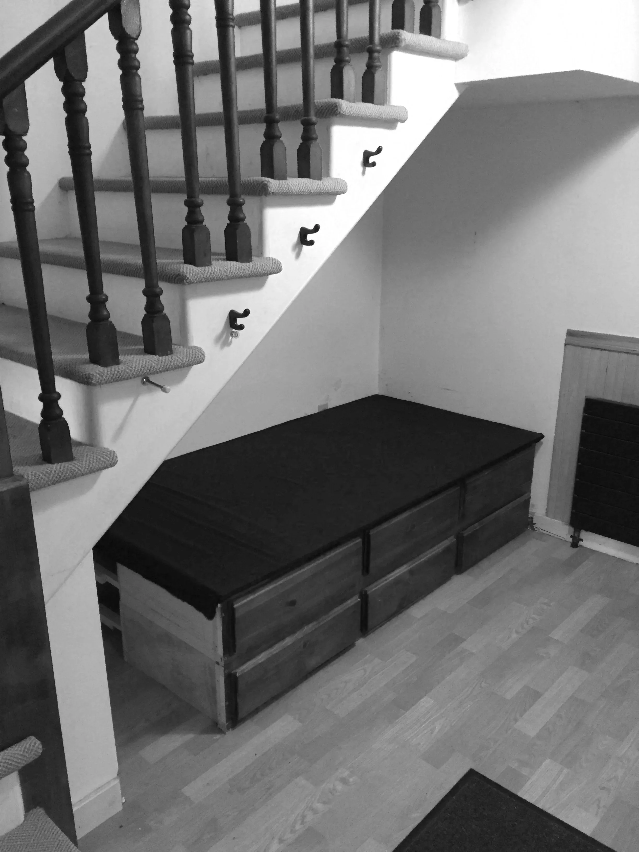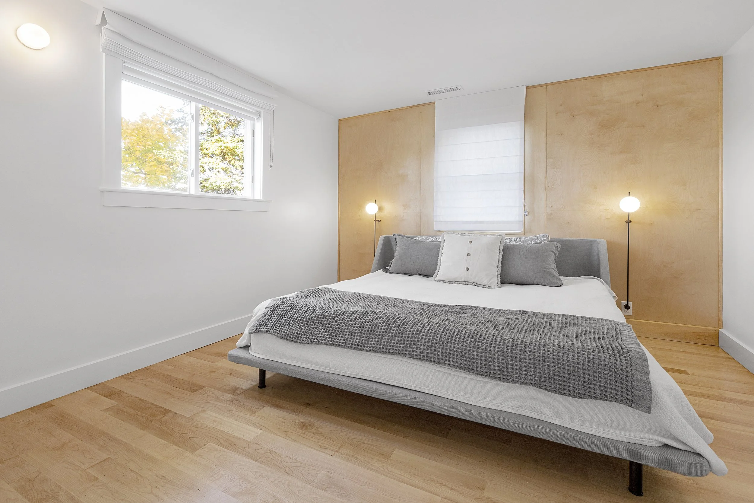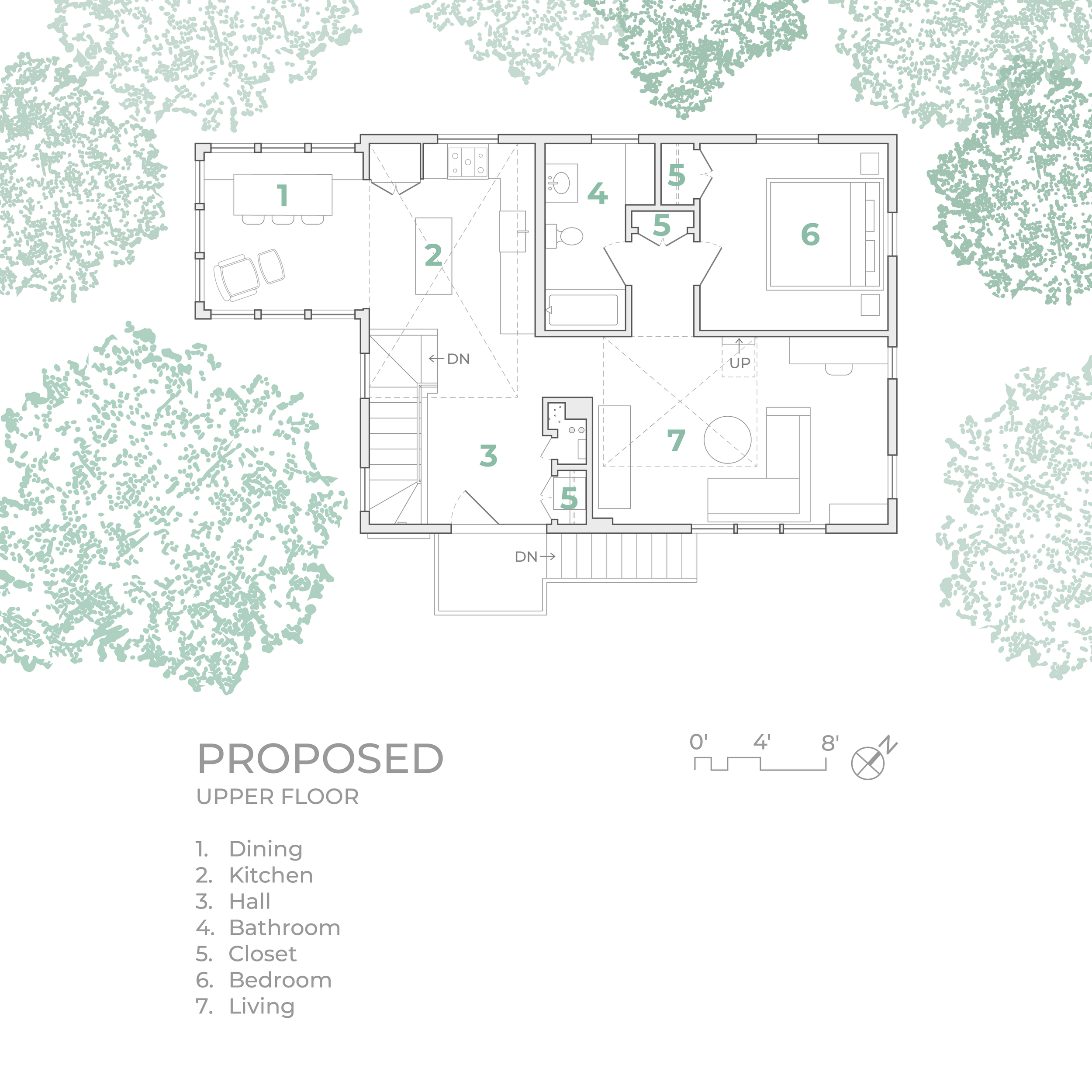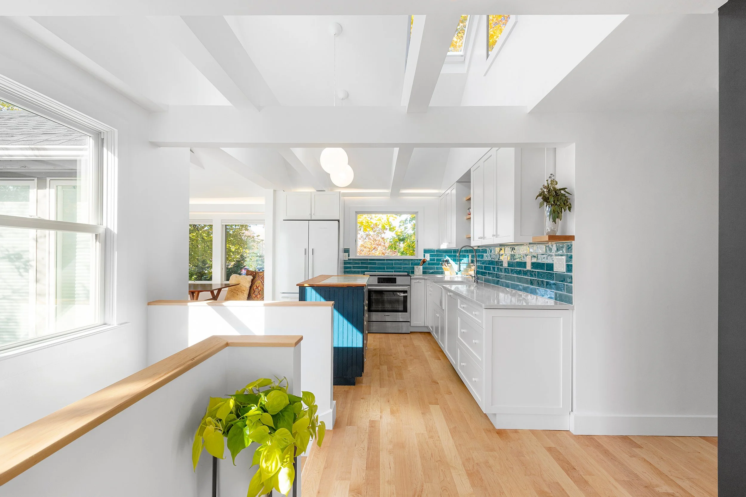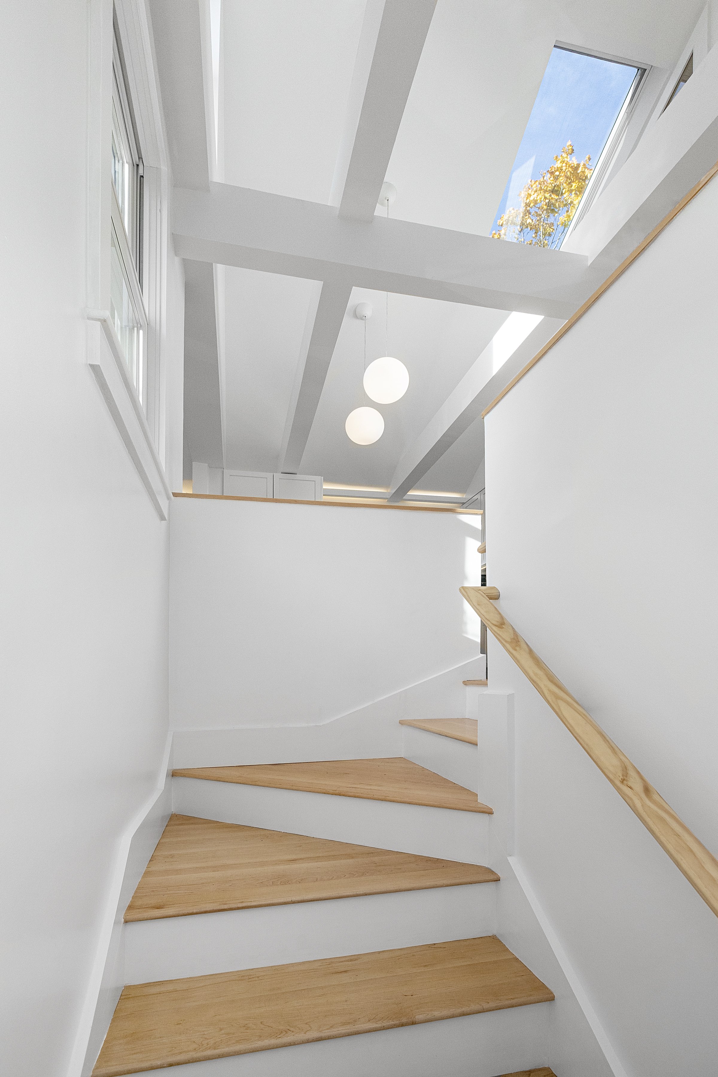 Huron Tree Loft uses adaptability and spatial adventure to overcome a challenging design brief. A petite upper floor flat was tasked with hosting a couple and occasional overnight visits from their children, so adaptable elements allow spaces to be temporarily transformed into sleeping areas and retained as open spaces when not in use. Enlarged dining room windows let the surrounding tree branches envelop the space while a plywood-lined loft accessed by a retractable ladder lends the excitement and coziness of a tree fort.
