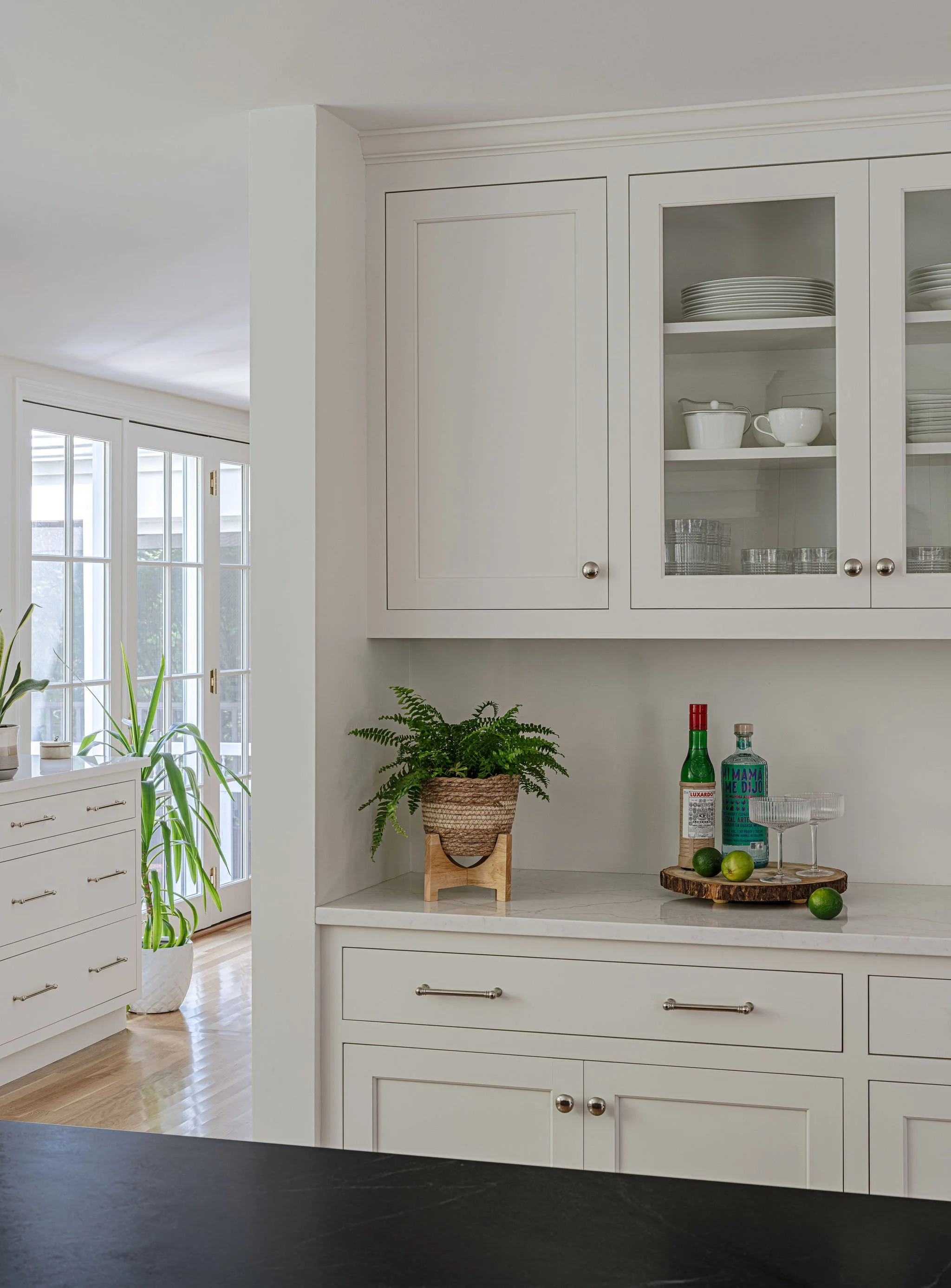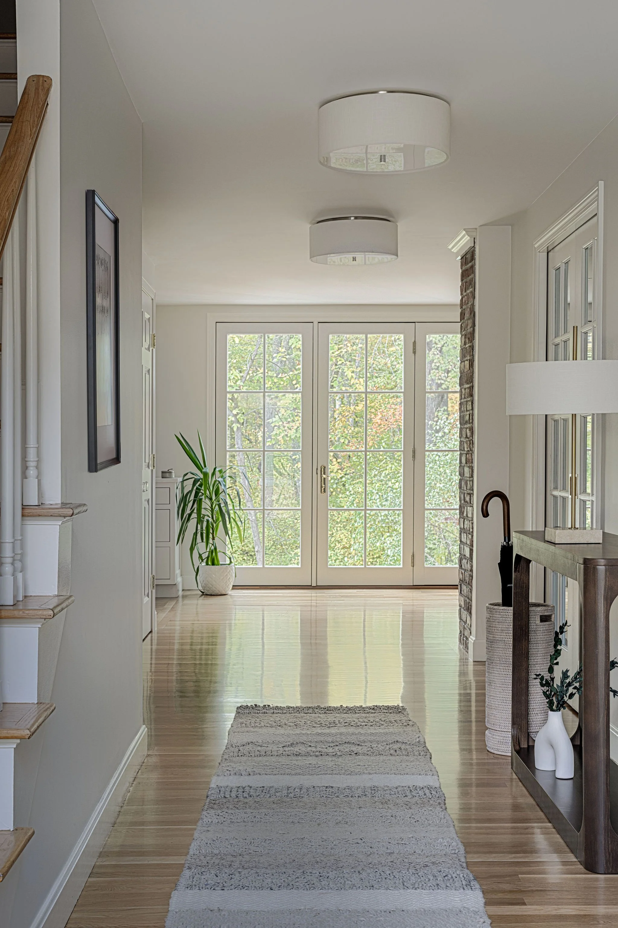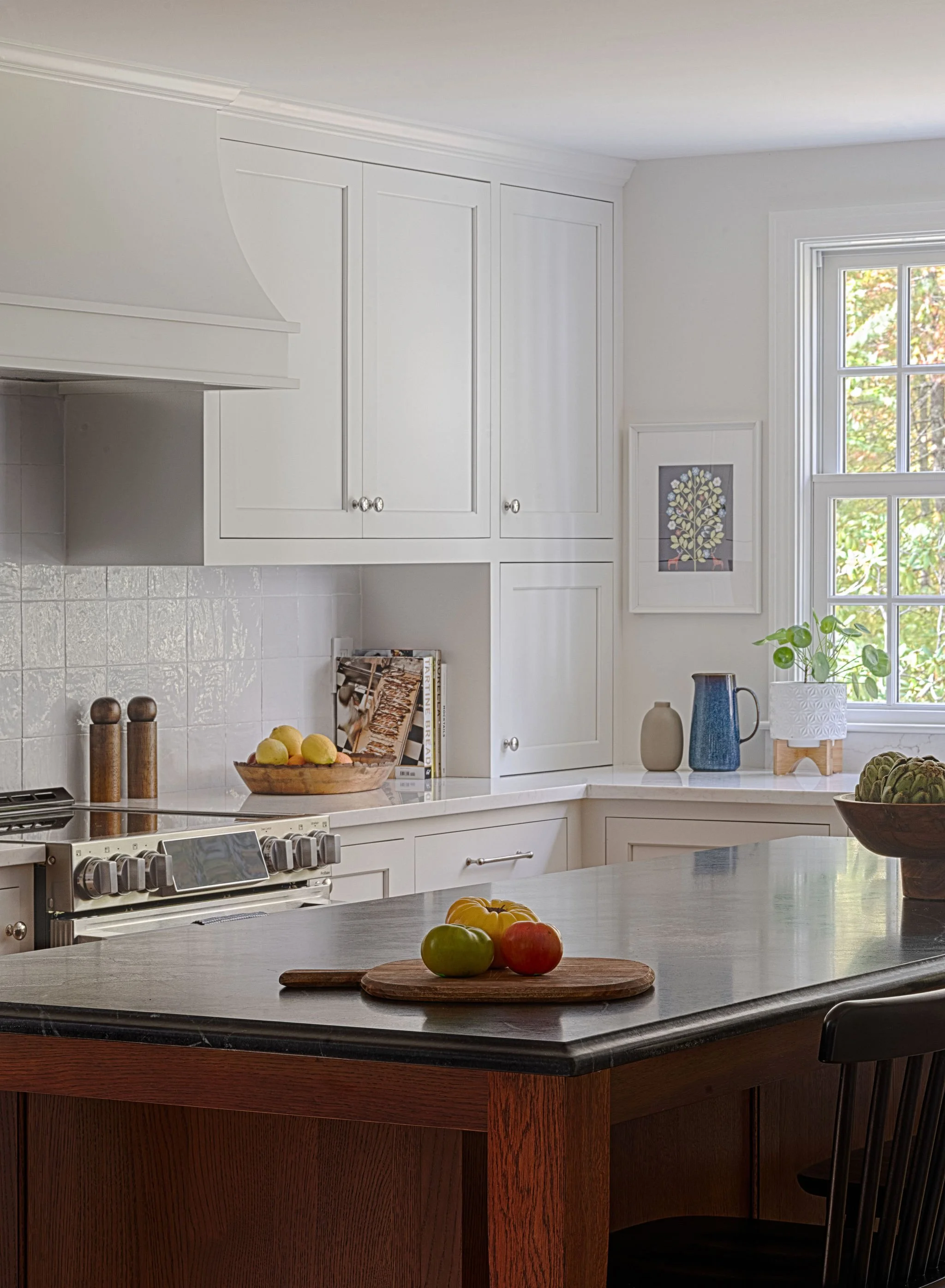 Given the richly wooded lot it sat on, this existing house had preciously few windows. Our renovation connected the kitchen, dining, and living areas at the back of the house and created new, larger openings to more fully connect spaces to the surrounding yard and forest. The entry hall was widened into a generous space to greet guests and beckon them towards the newly luminous rear living spaces. Upstairs, the primary suite was reconfigured to provide a lofted ceiling, increase storage, and make a larger, more graceful bathroom.