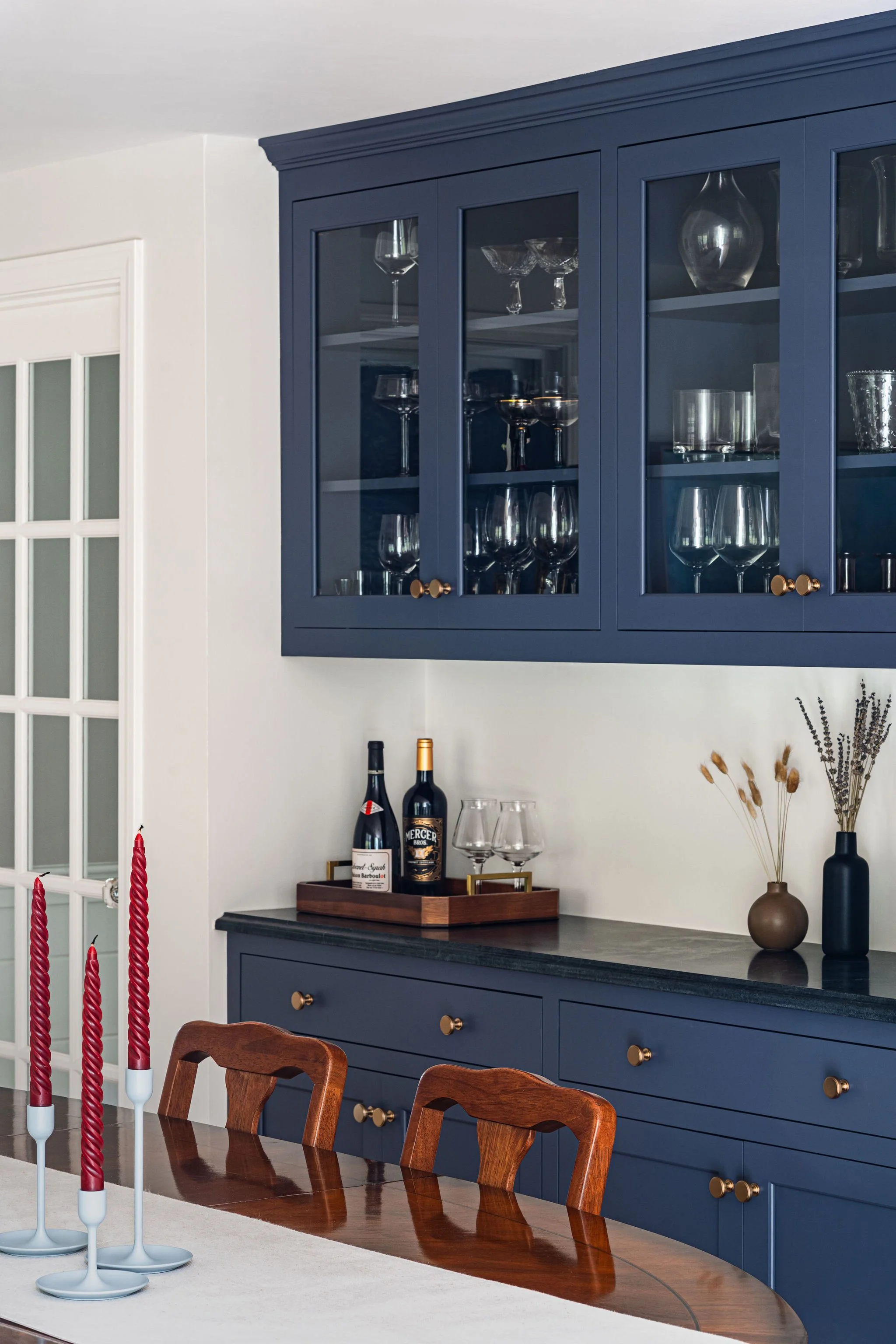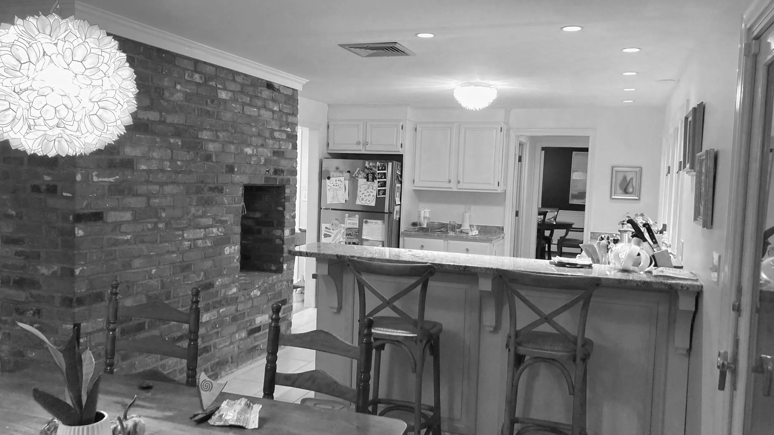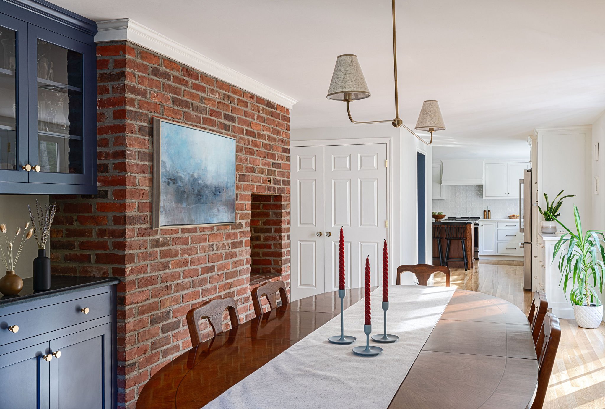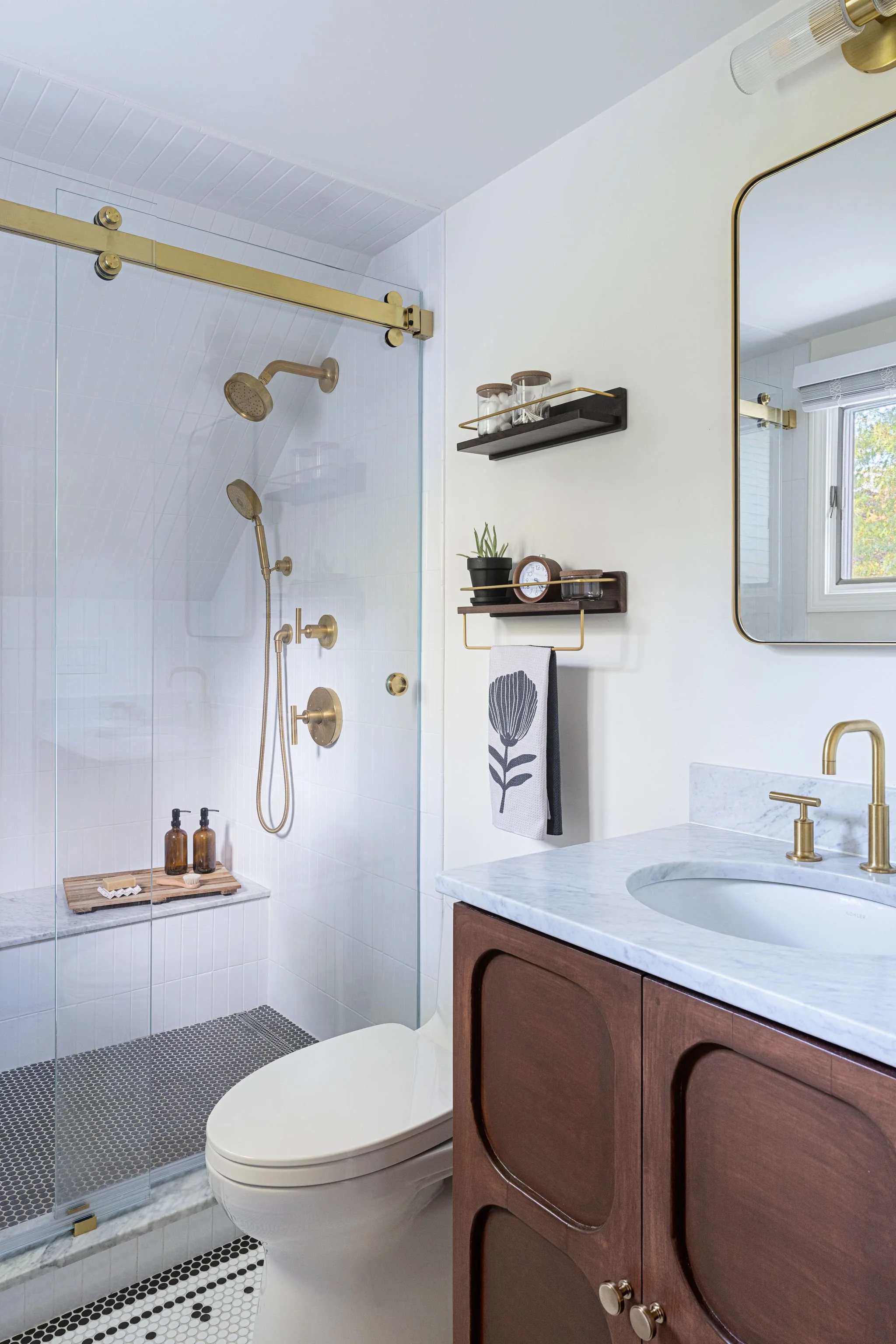 Given the richly wooded lot it sat on, this existing house had preciously few windows. Our renovation connected the kitchen, dining, and living areas at the back of the house and created new, larger openings to more fully connect spaces to the surrounding yard and forest. The entry hall was widened into a generous space to greet guests and beckon them towards the newly luminous rear living spaces. Upstairs, the primary suite was reconfigured to provide a lofted ceiling, increase storage, and make a larger, more graceful bathroom.