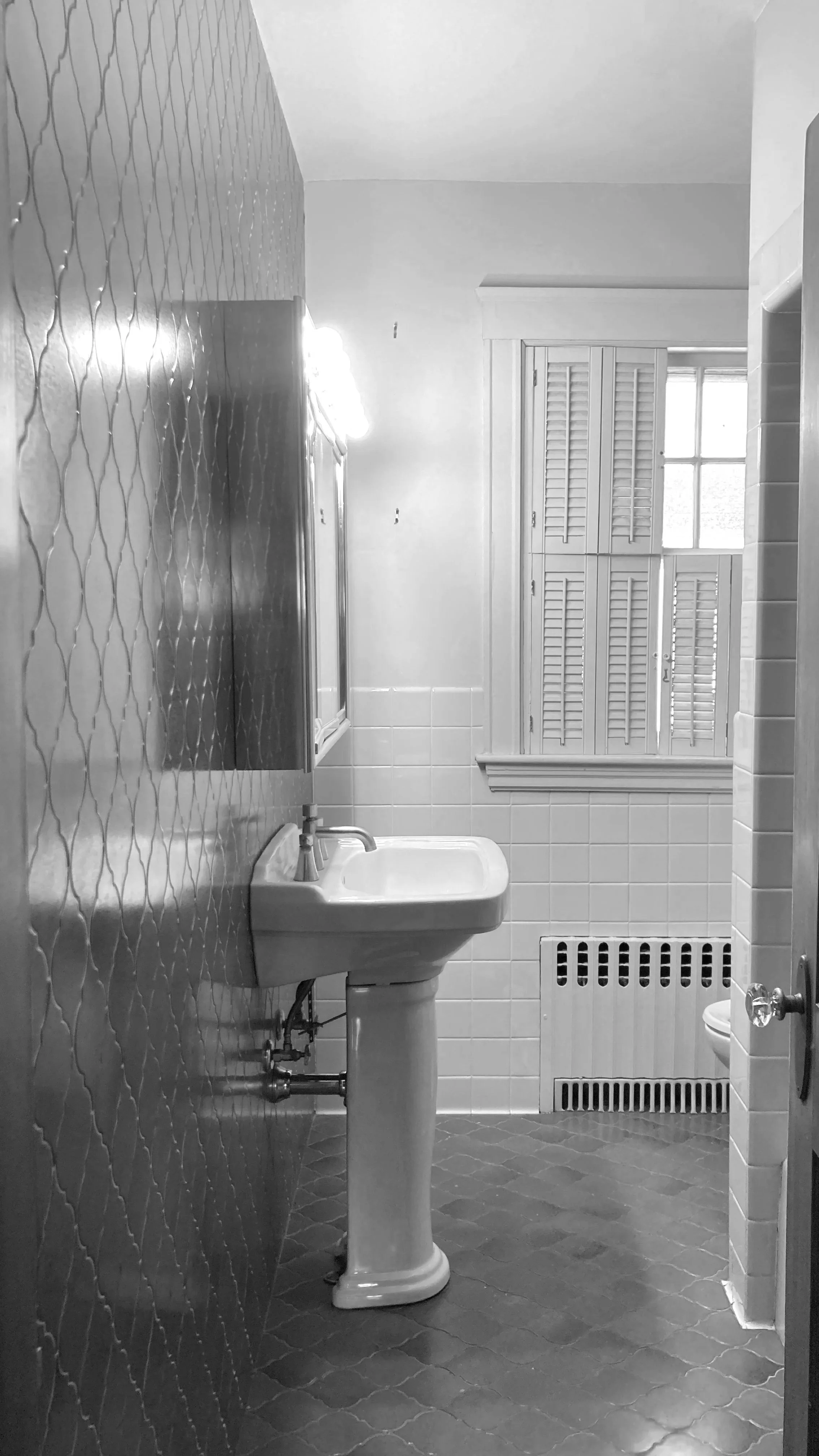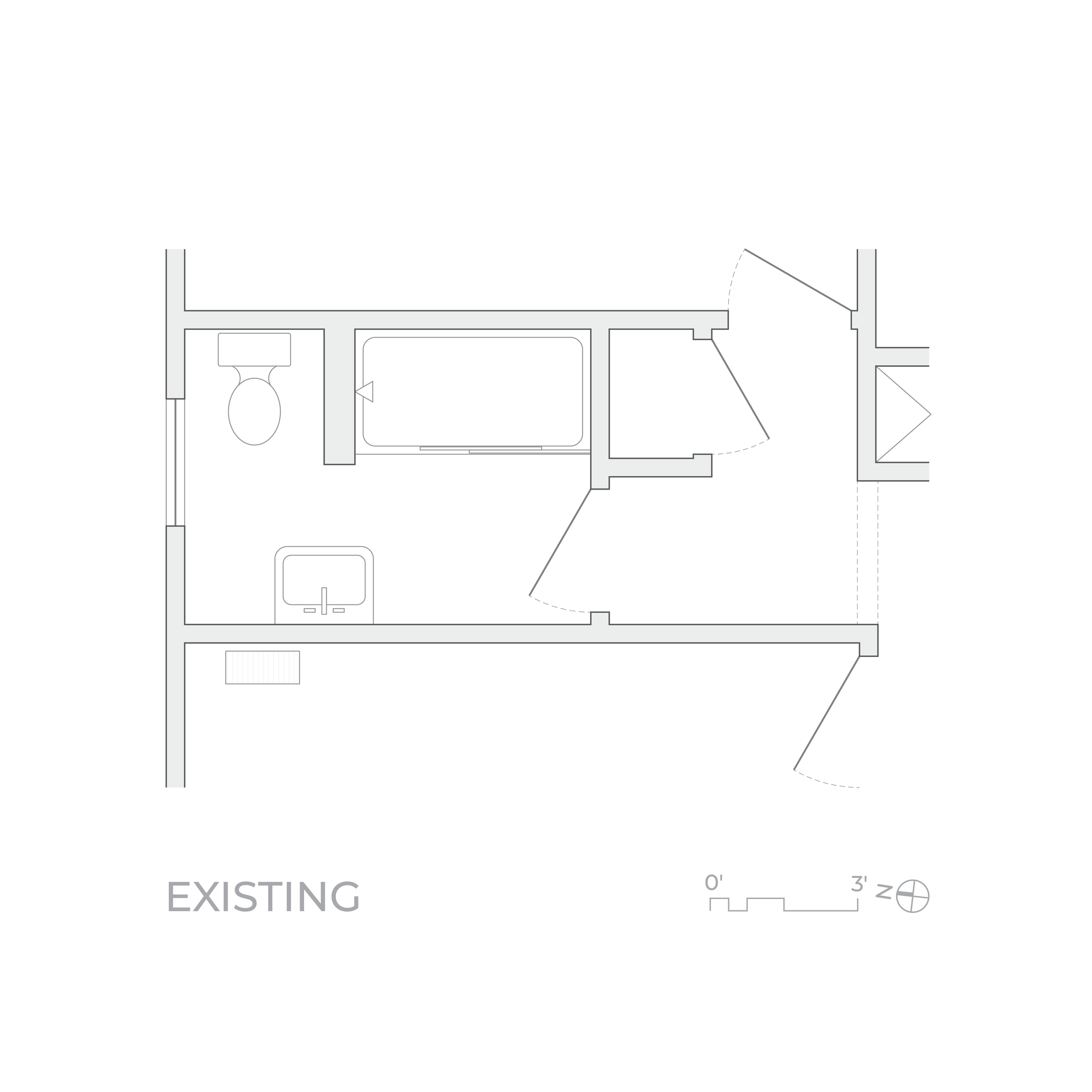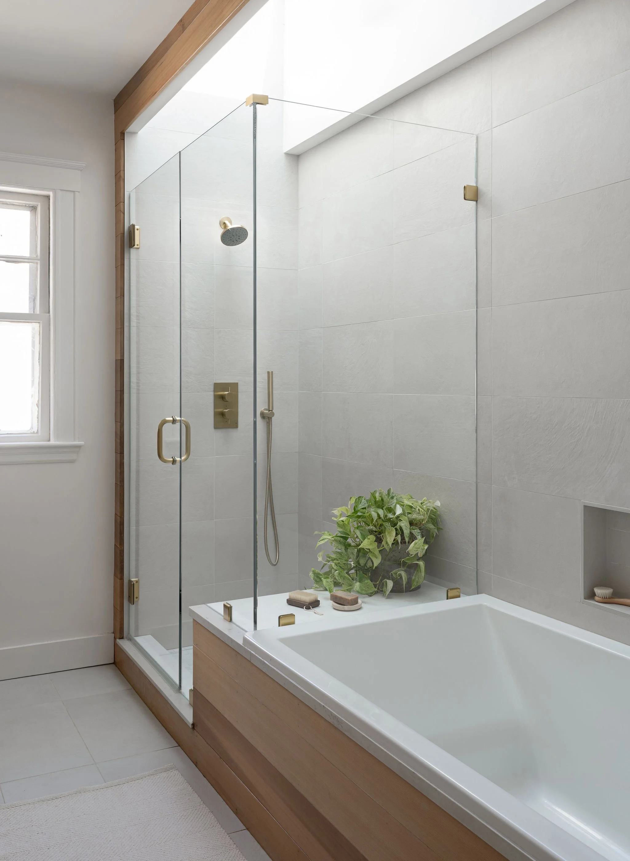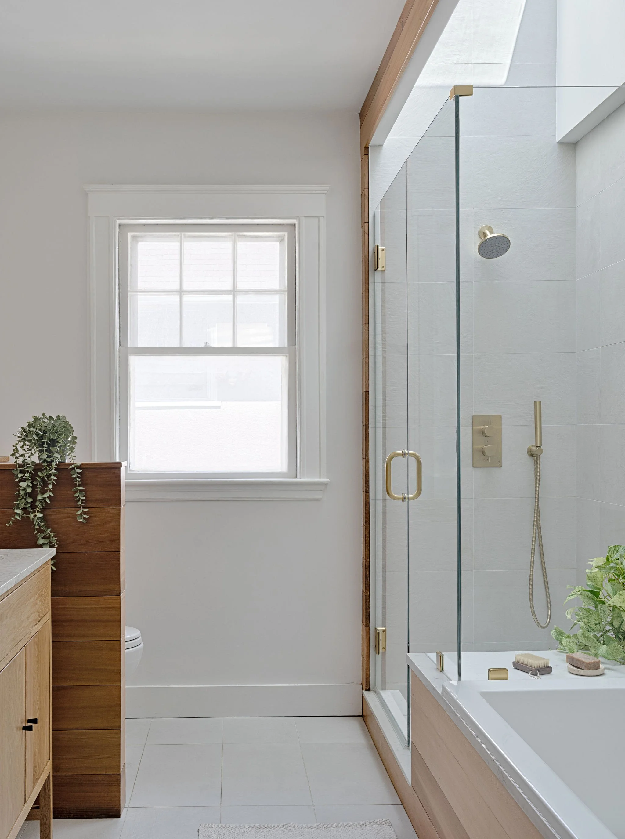 This bathroom renovation is on the second floor of a house with an attic above it, so our proposal to add a skylight to light the space was initially met with confusion by our client. By borrowing space from the low portion of the attic above, we created a deep skylight well that brings unexpected daylight and sky views to the tub/shower combo below.