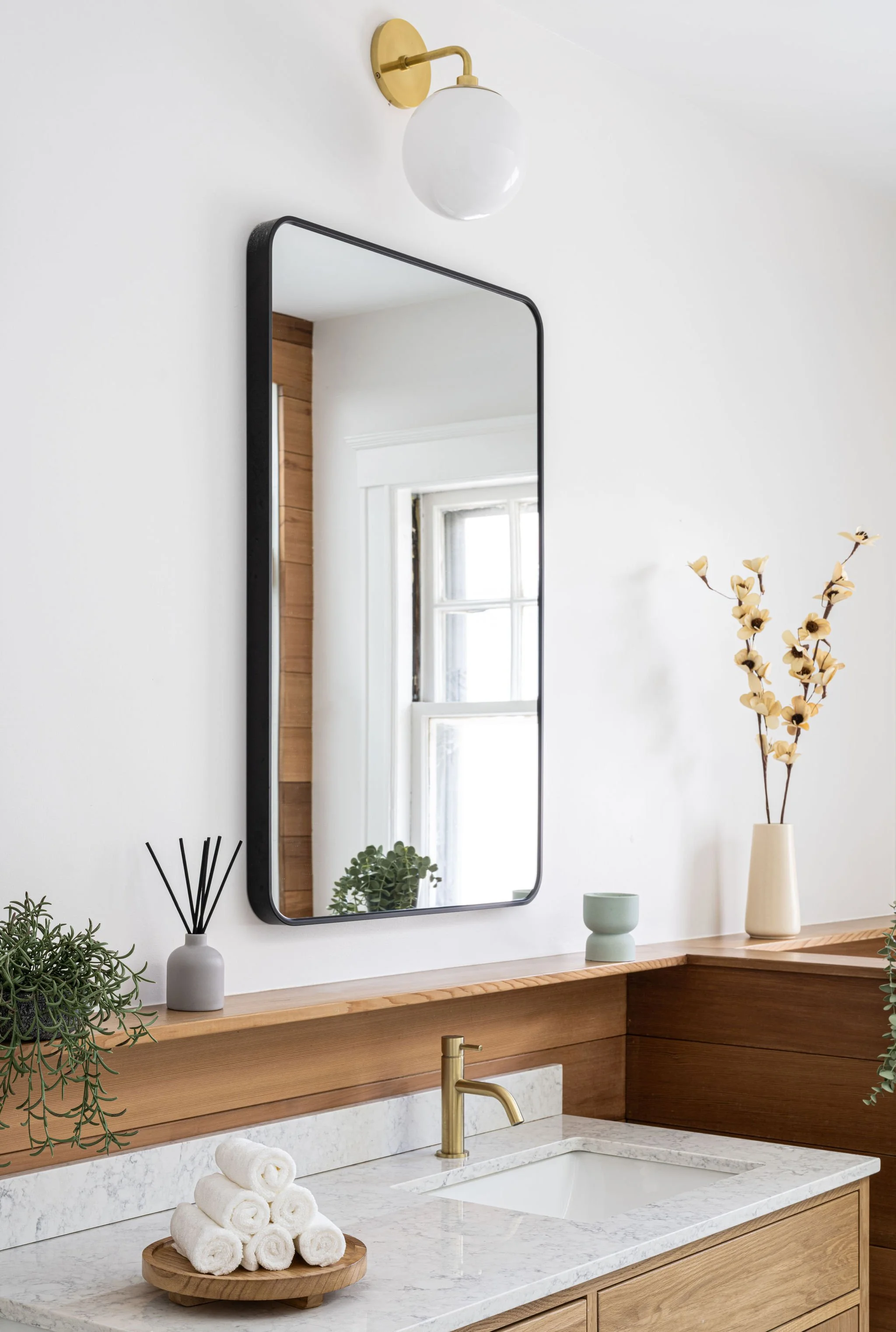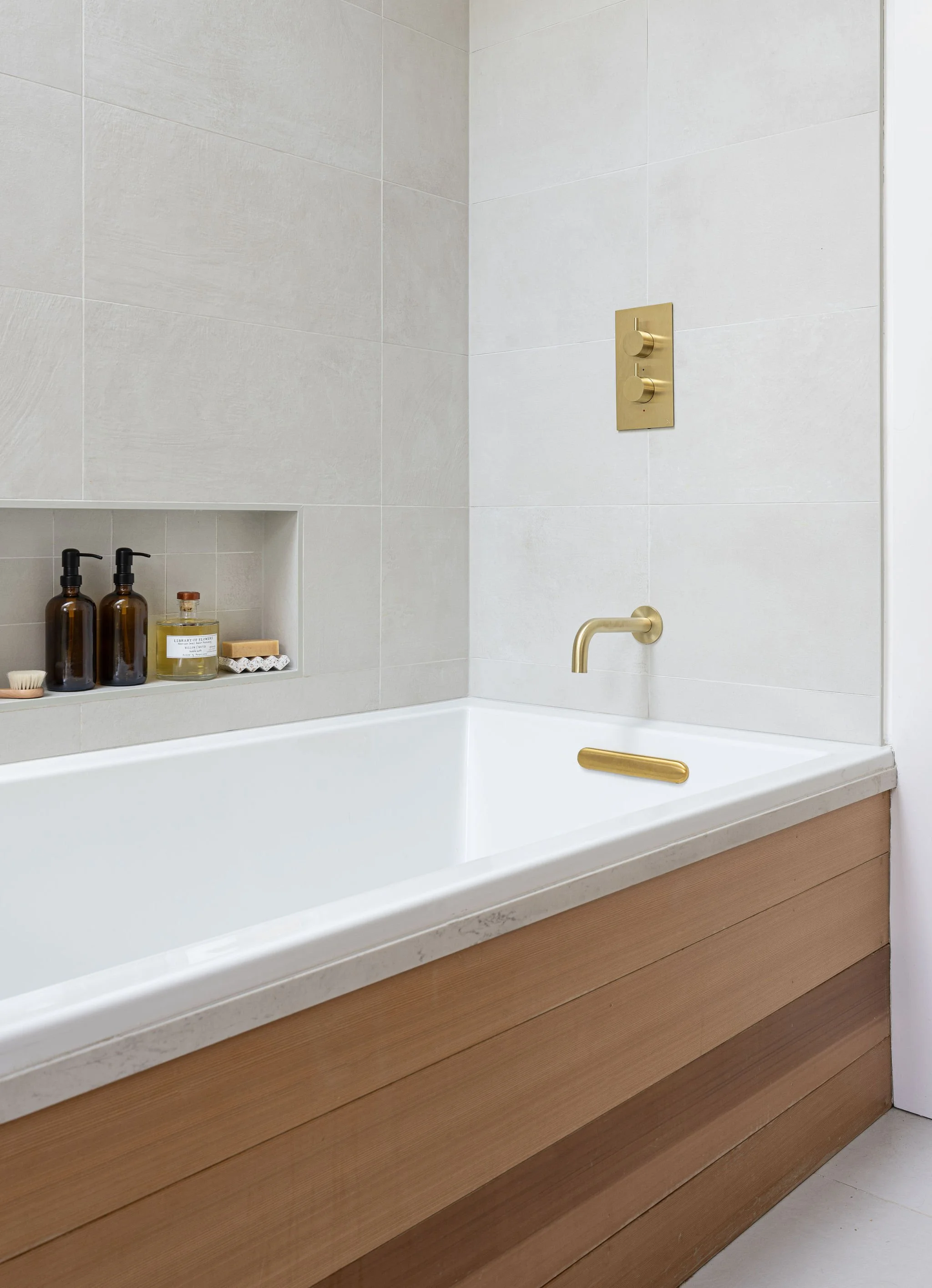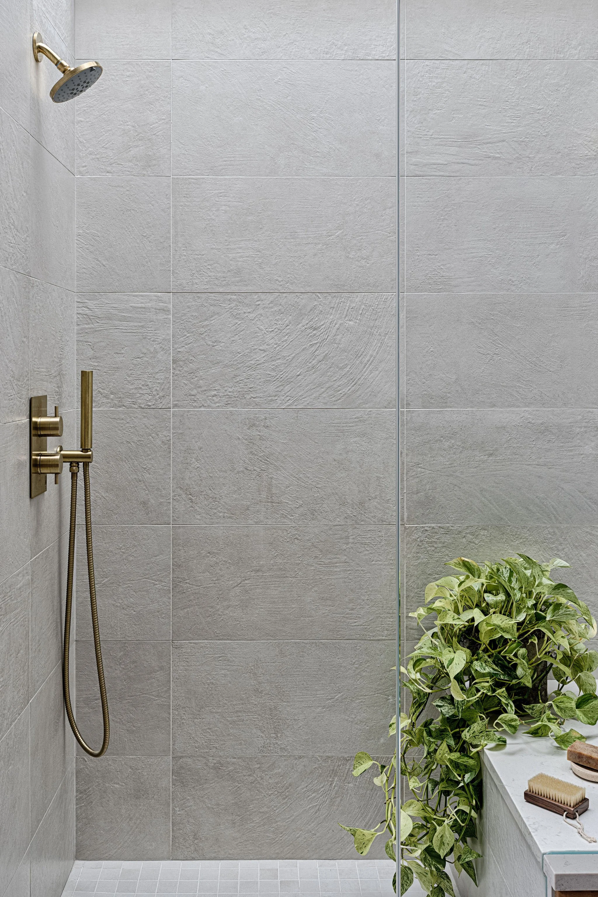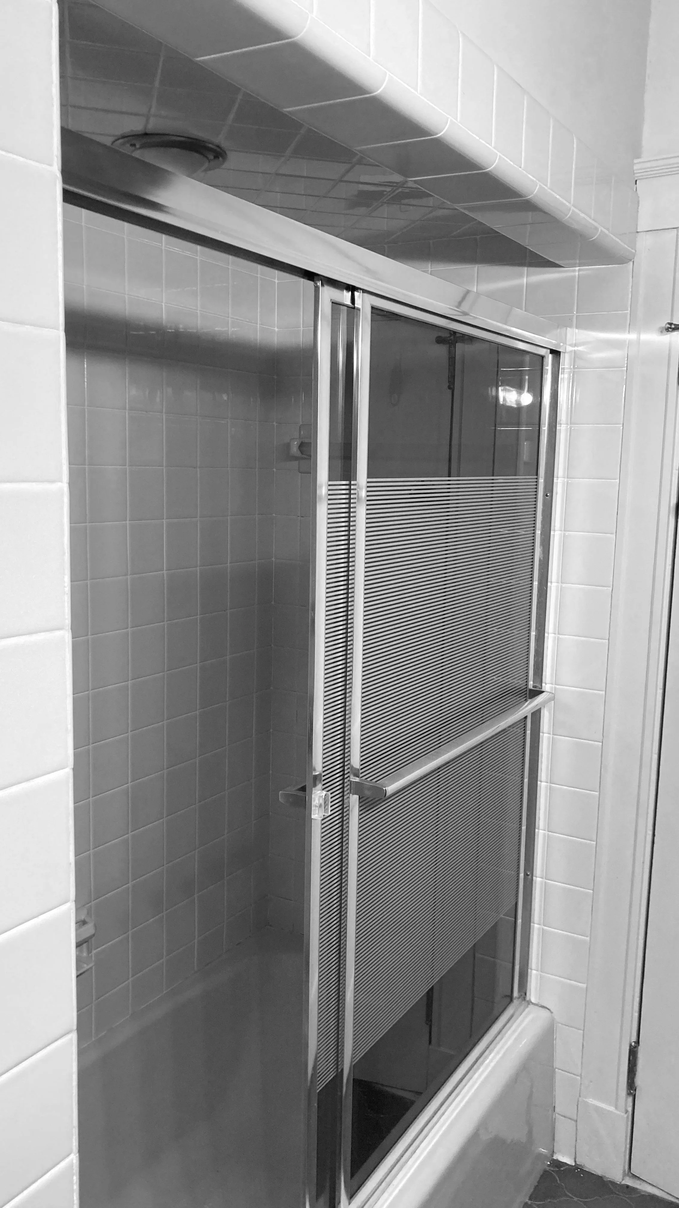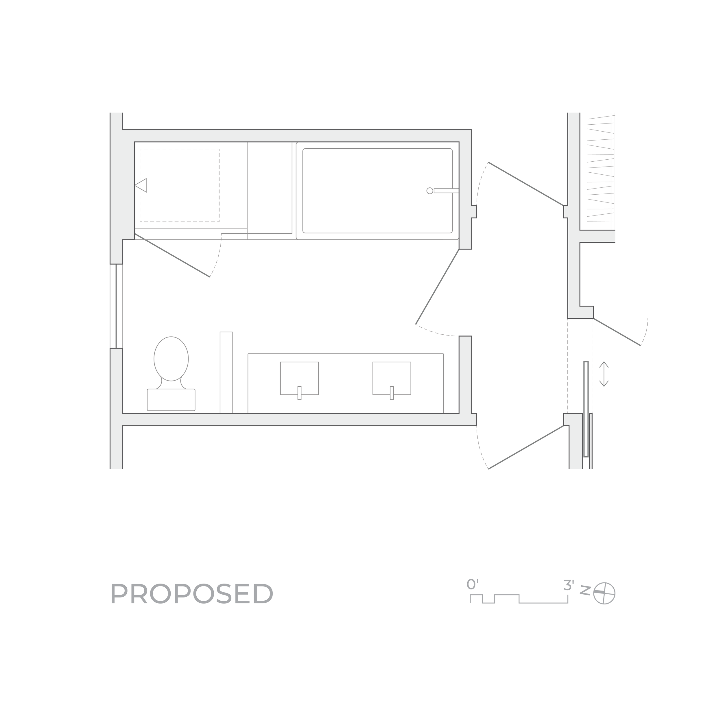 This bathroom renovation is on the second floor of a house with an attic above it, so our proposal to add a skylight to light the space was initially met with confusion by our client. By borrowing space from the low portion of the attic above, we created a deep skylight well that brings unexpected daylight and sky views to the tub/shower combo below.