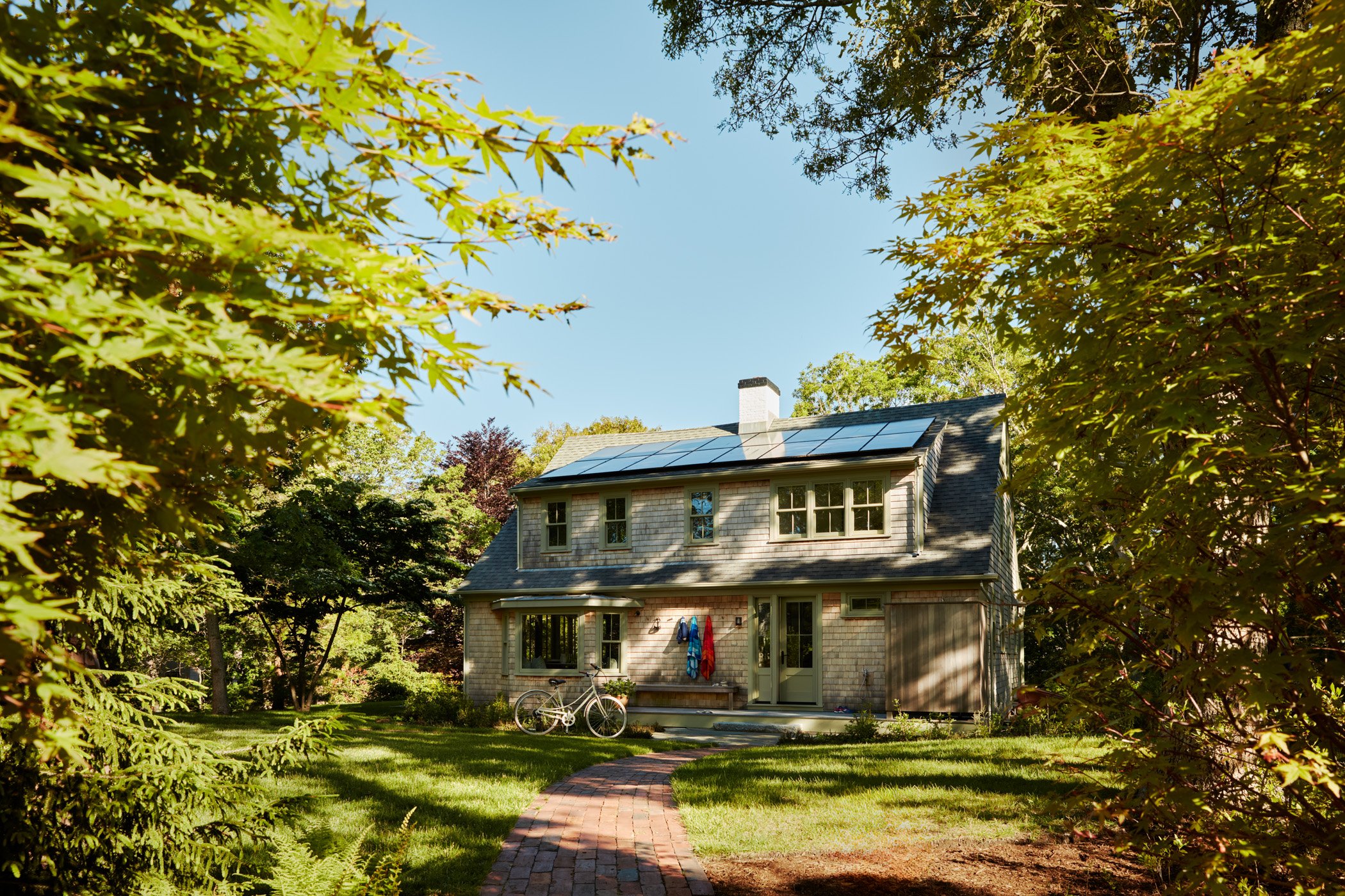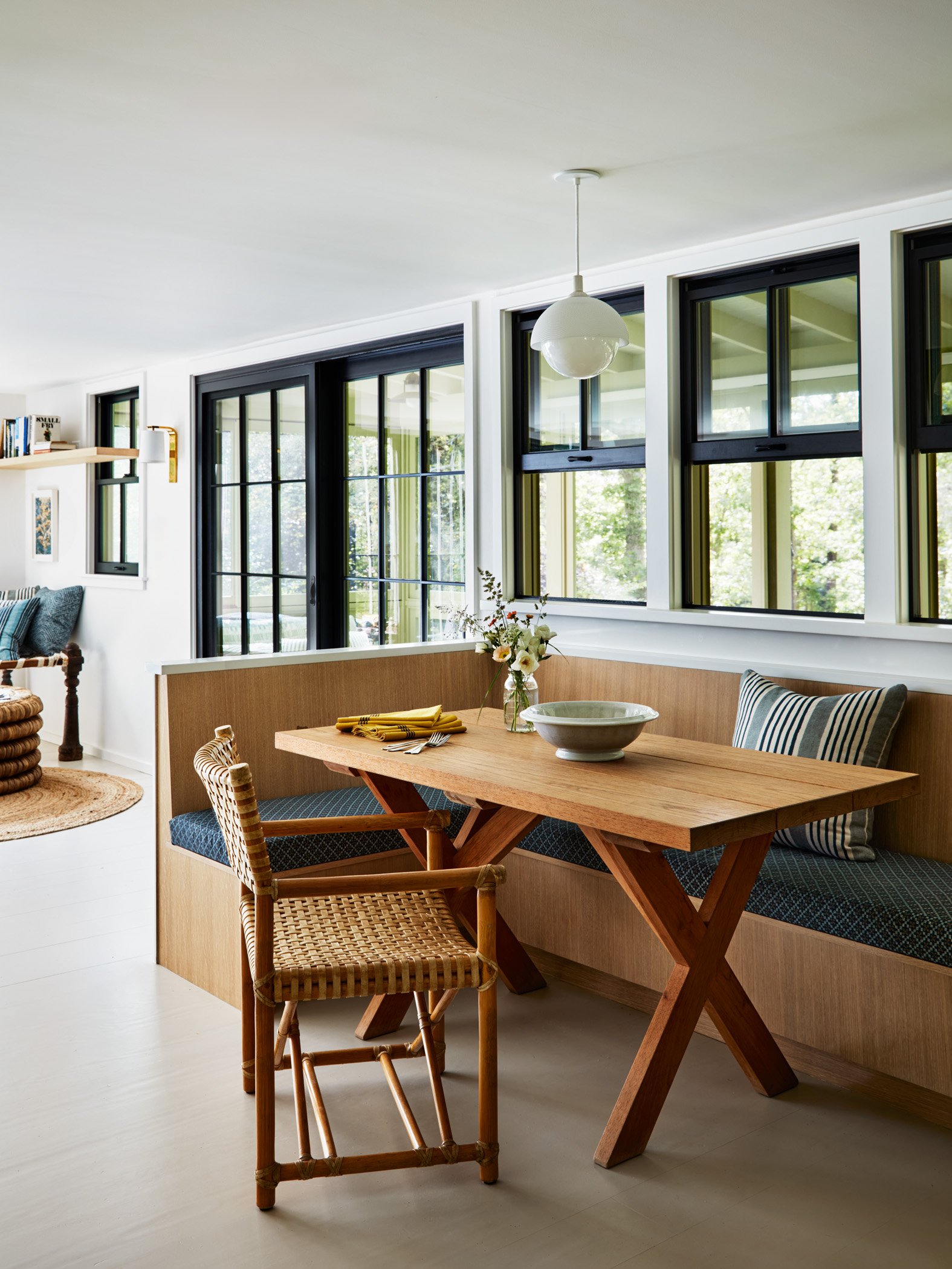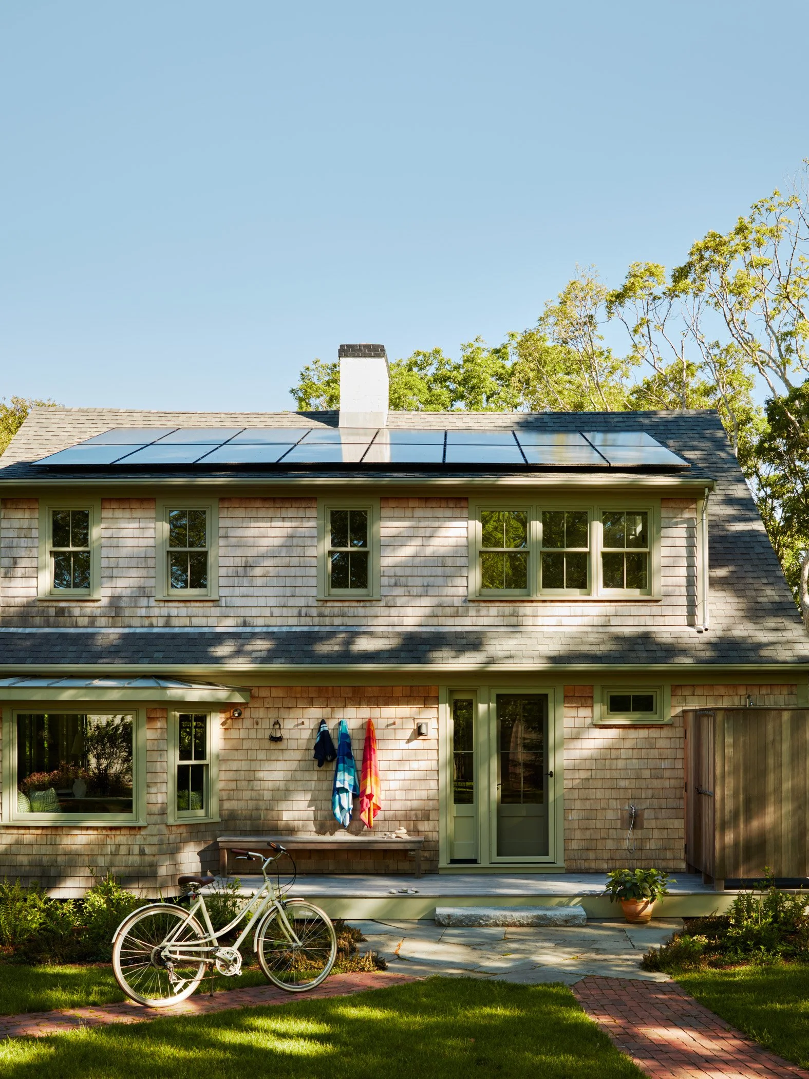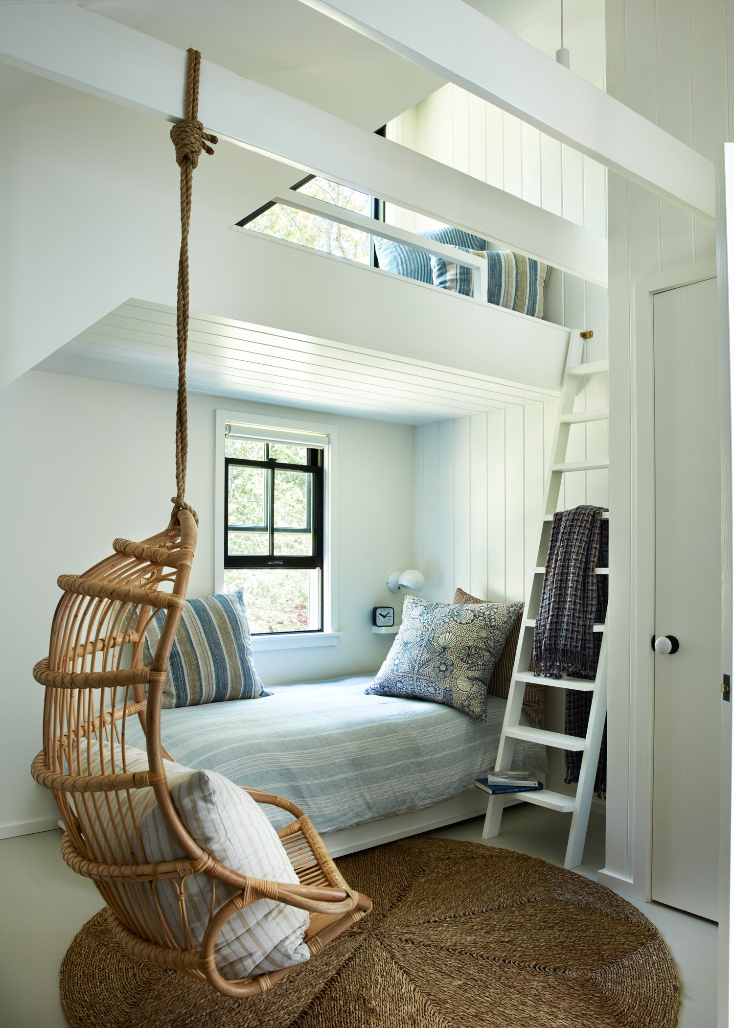 Renting this rustic Martha’s Vineyard cottage named Summertime had been an annual highlight of a Boston area family for years before they purchased it in 2021 to make it their own and equip it for year-round use. A new, full-height finished basement was added beneath the house to add more living space while a new screened porch lines the entire oceanside of the house to maximize outdoor living. The ground floor was reconfigured to streamline flow and give a more spacious feel to the spaces. A new laundry room is located directly by the front door to receive wet/sandy items from the nearby beach while the kitchen is placed alongside the new porch to facilitate outdoor dining. Upstairs, the primary suite was given a modern facelift while the secondary bedrooms took on a playful summer camp feel with a loft lounge and hanging chair.