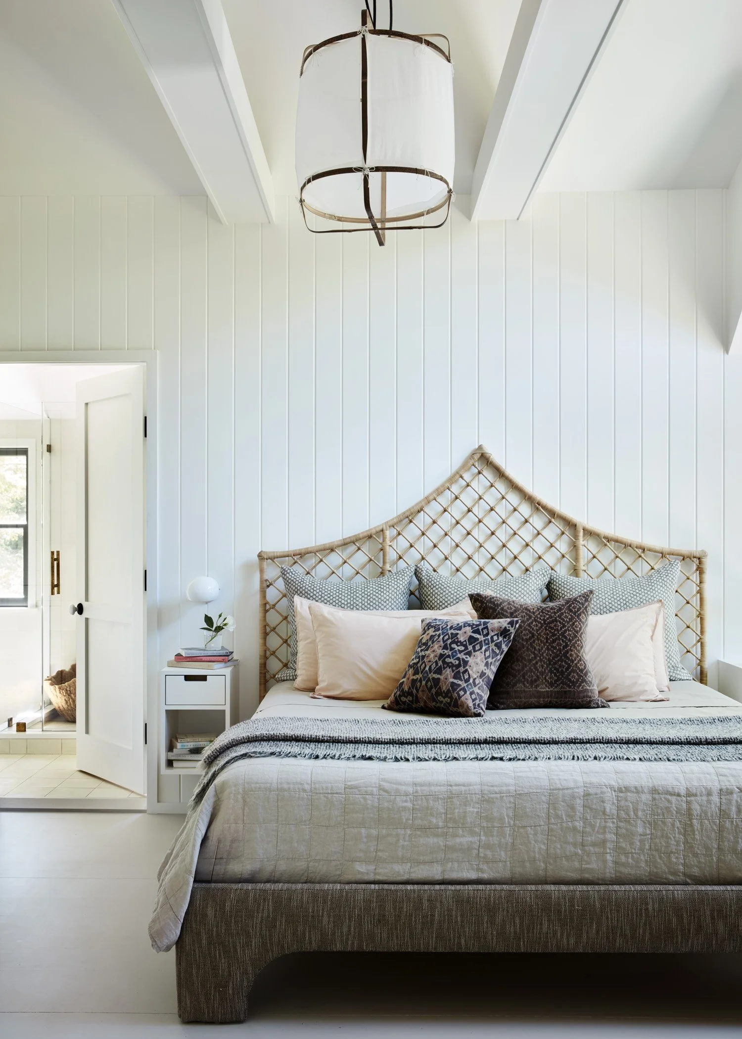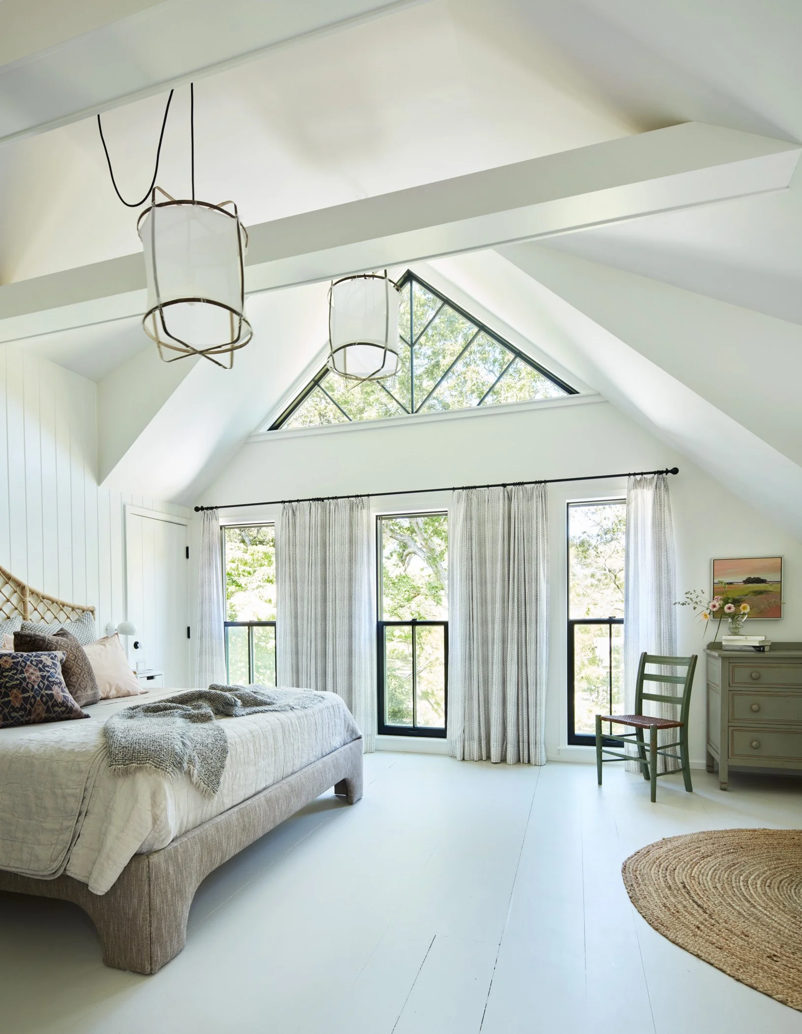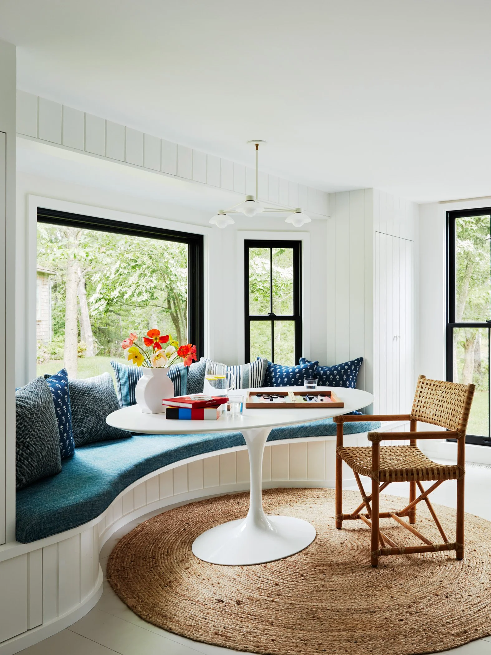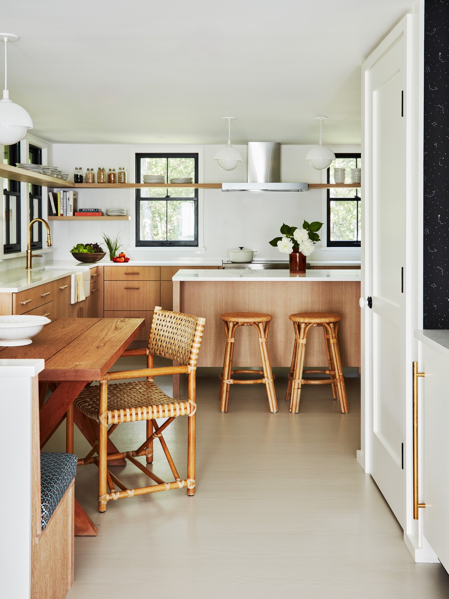 Renting this rustic Martha’s Vineyard cottage named Summertime had been an annual highlight of a Boston area family for years before they purchased it in 2021 to make it their own and equip it for year-round use. A new, full-height finished basement was added beneath the house to add more living space while a new screened porch lines the entire oceanside of the house to maximize outdoor living. The ground floor was reconfigured to streamline flow and give a more spacious feel to the spaces. A new laundry room is located directly by the front door to receive wet/sandy items from the nearby beach while the kitchen is placed alongside the new porch to facilitate outdoor dining. Upstairs, the primary suite was given a modern facelift while the secondary bedrooms took on a playful summer camp feel with a loft lounge and hanging chair.