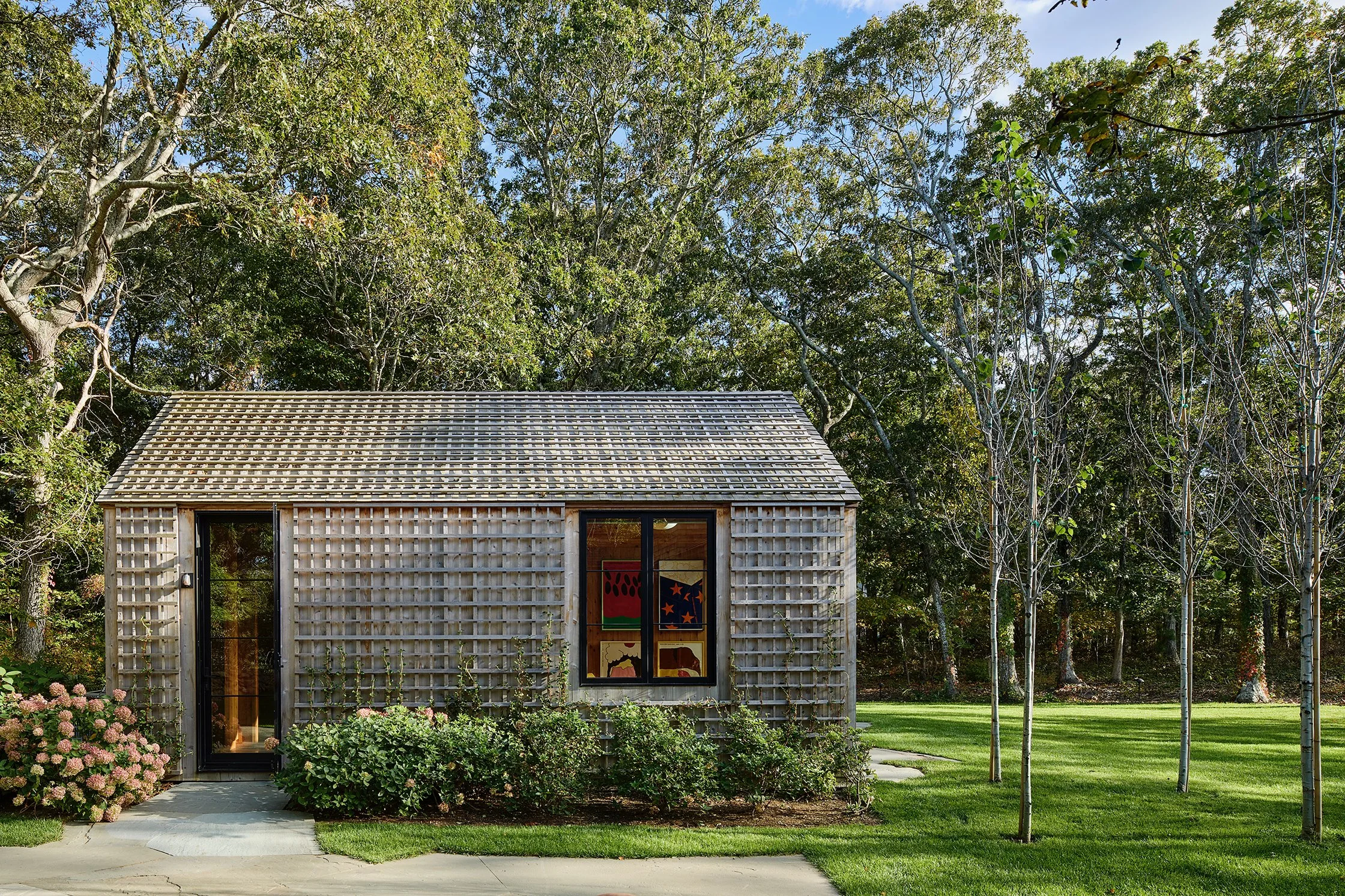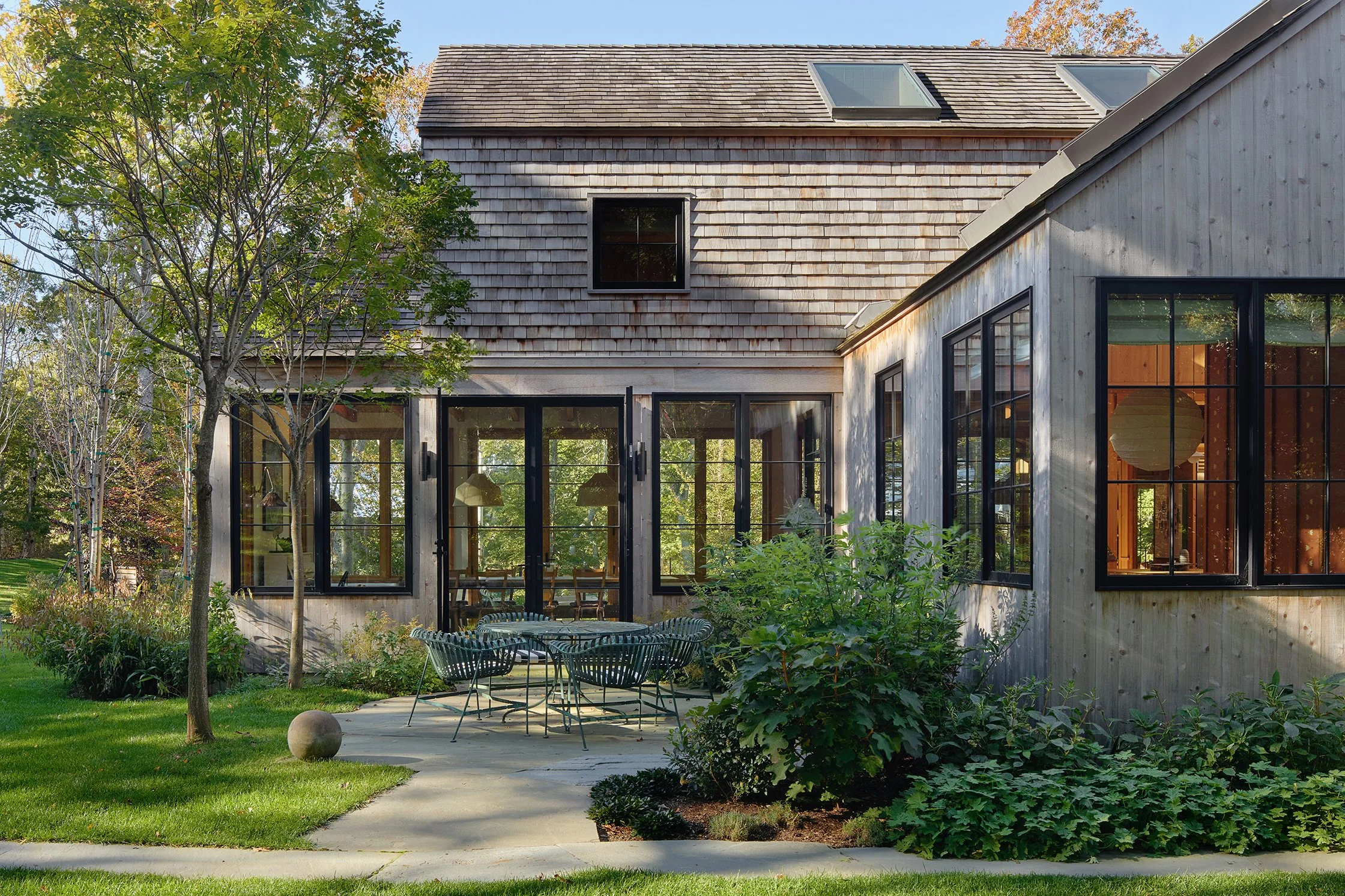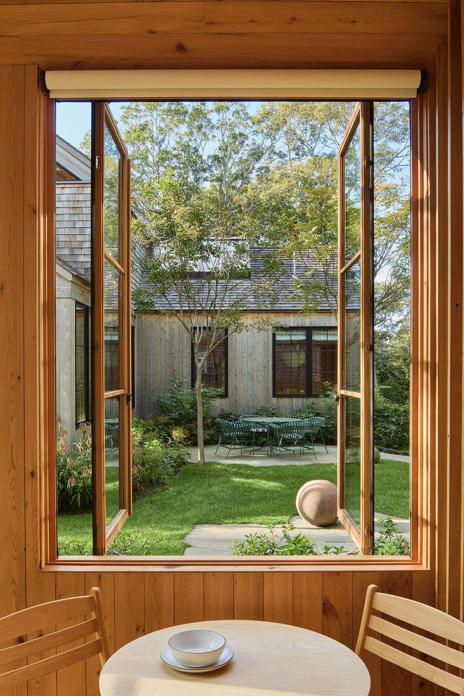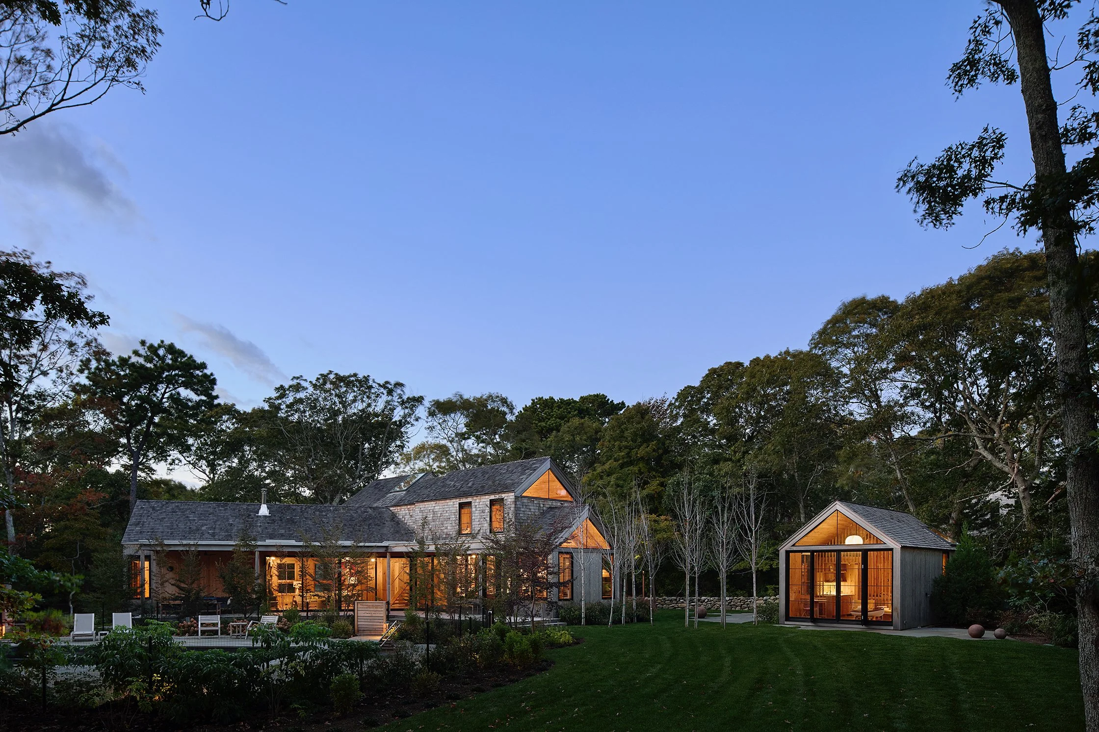 A petite guest house frames a rear courtyard and opens onto the yard with a private terrace.