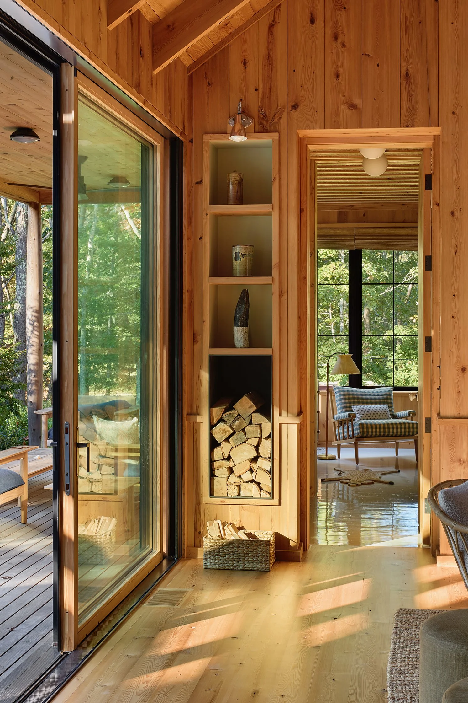 Interiors are lined with salvaged hemlock paneling while the exterior is clad with character grade cedar planks and shingles that are allowed to naturally grey.