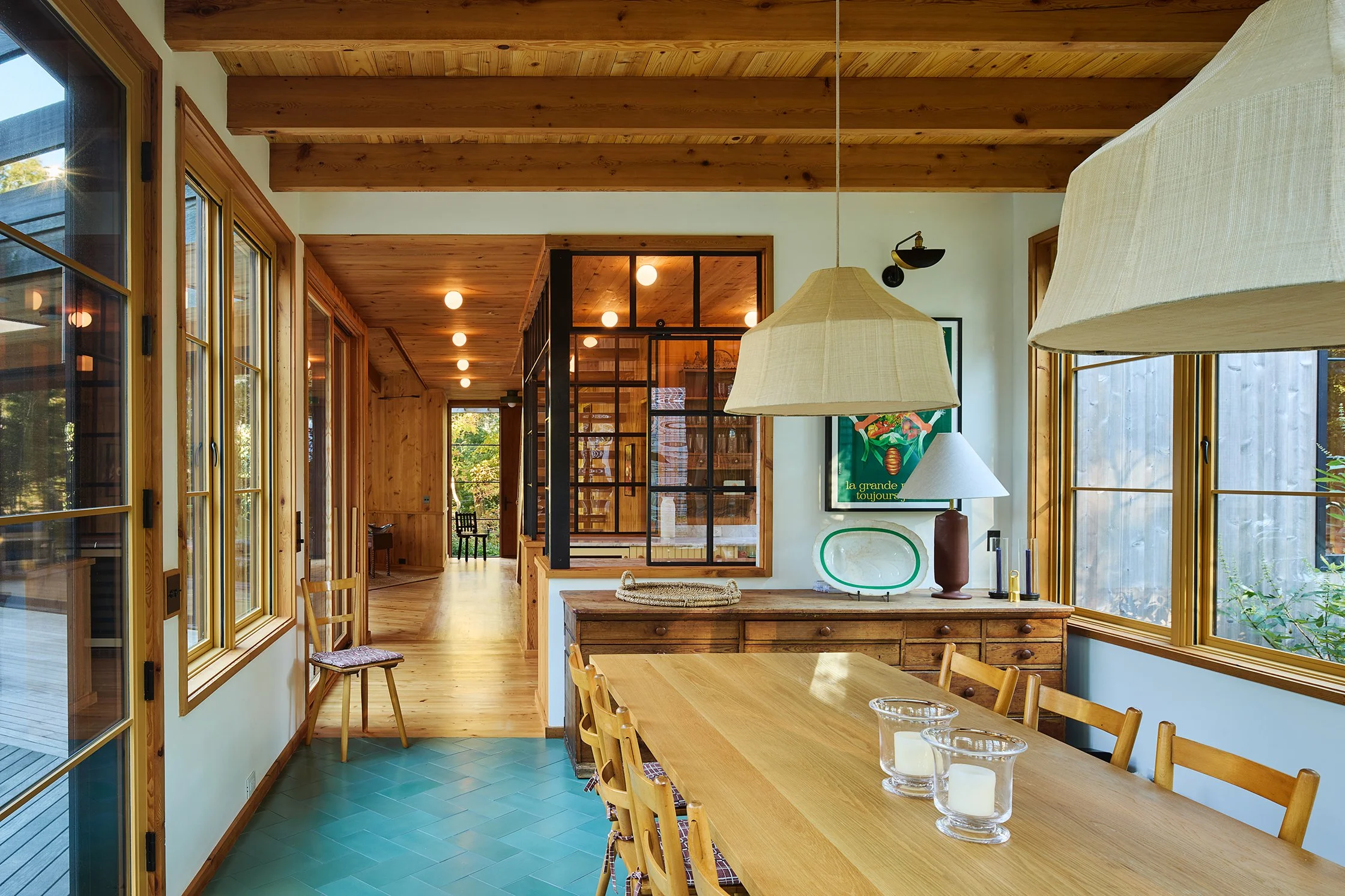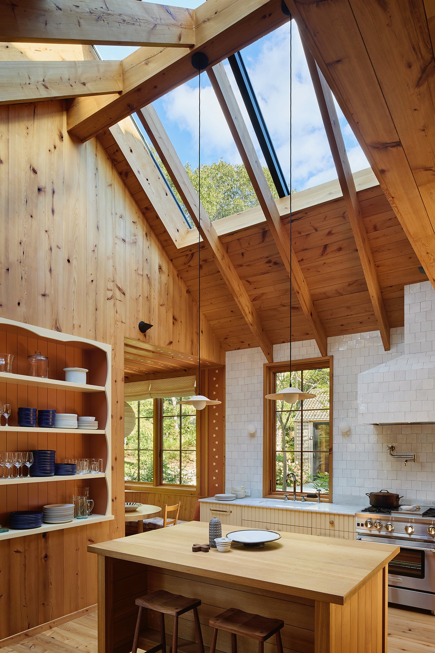 Given the family’s love for cooking and hosting, the kitchen occupies the heart of the pinwheel, a nexus of family activity and gathering. A lofted ceiling with a commercial skylight makes the space especially luminous while an interior steel-framed glass system connects it with the formal dining space through an operable sliding window. Also at the center of the home is the double-height stair hall with skylights highlighting where the arms of the pinwheel meet.