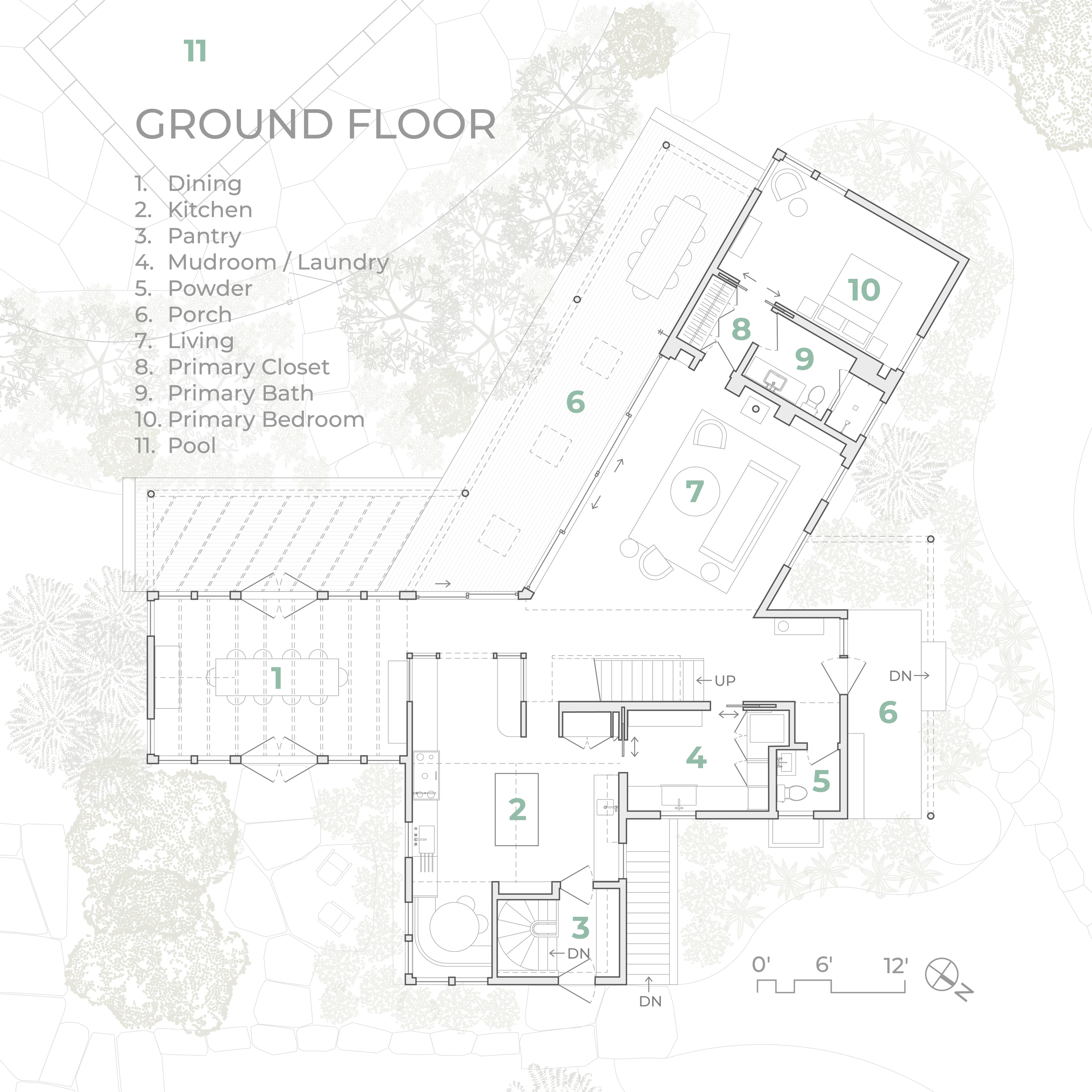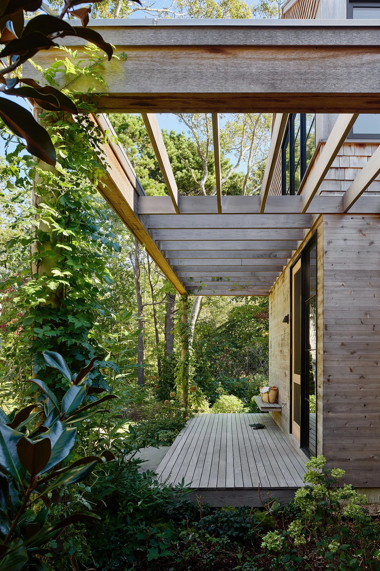 Located in the family friendly West Chop neighborhood of Martha’s Vineyard, this summer home is designed for a family of restaurateurs to host family and friends while immersed in the natural splendor of the site. The house is configured as a pinwheel with each arm maximally surrounded by nature and the spaces nestled between arms forming intimate courtyards and a pool. Trellises, porches, and landscape paths stitch the building and site together while carefully preserved, mature cedar trees envelope the house.